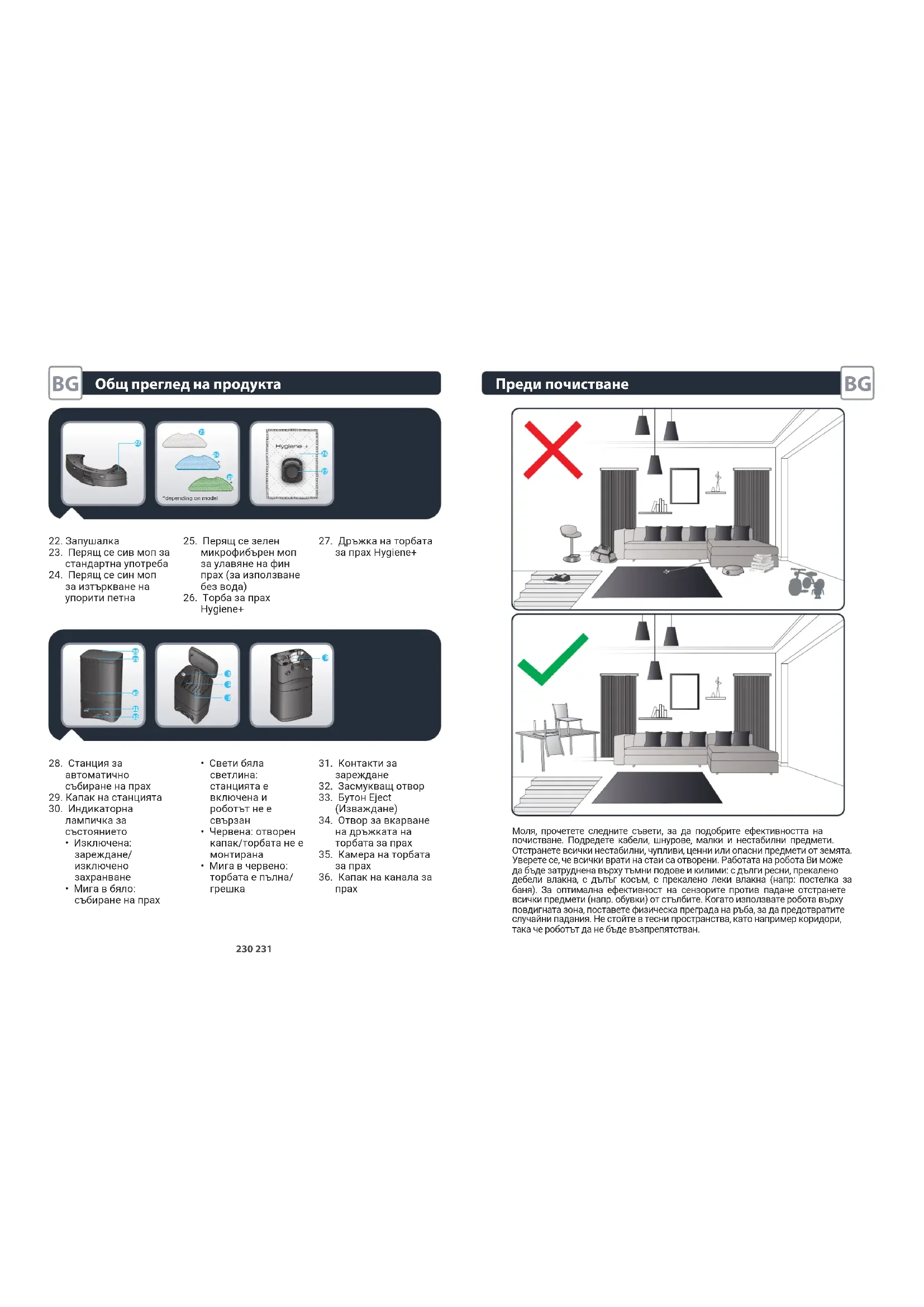 - Rotițișiapăsațiroțilepentruavericadacănuexistăvreunobiectstrăin înfășuratsaublocatșiîndepărtați-ldacăestecazul. Probleme obișnuite și soluții RO227 Какво има в кашона? Страница 228 Общ преглед на продукта Страница 229 Преди почистване Страница 231 Монтиране на робота Страница 232 Свързване на робота с безплатното приложение Страница 234 Използване на основните функции на приложението Страница 234 Използване на робота без приложението Страница 235 Използване на робота с функцията за моп Страница 236 Поддръжка на робота и неговите аксесоари Страница 240 Смяна на торбата за прах, когато се напълни Страница 245 Честота на смяна на компонентите Страница 247 Съхраняване на робота, когато той не се използва Страница 248 Какво да правим и какво да не правим Страница 248 Отмяна на сдвояването с Вашия робот Страница 251 Често срещани проблеми и решения Страница 252 За повече информация: www.rowenta.com Моля, прочетете внимателно книжката „Инструкции за безопасност и употреба“ преди първа употреба. BG228 229 Какво има в кашона?