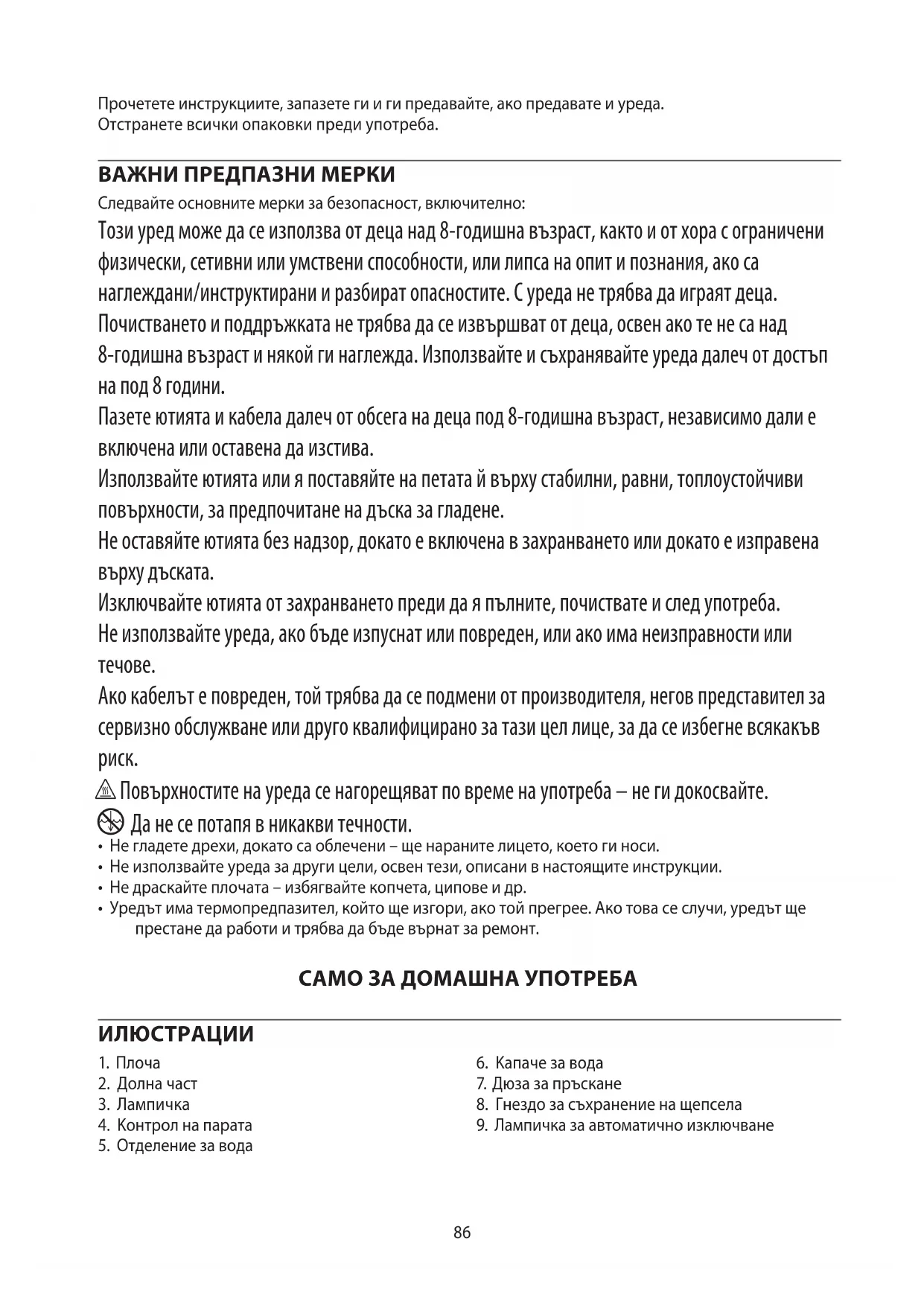 AE86 Прочетете инструкциите, запазете ги и ги предавайте, ако предавате и уреда. Отстранете всички опаковки преди употреба. ВАЖНИ ПРЕДПАЗНИ МЕРКИ Следвайте основните мерки за безопасност, включително: Този уред може да се използва от деца над 8-годишна възраст, както и от хора с ограничени физически, сетивни или умствени способности, или липса на опит и познания, ако са наглеждани/инструктирани и разбират опасностите. С уреда не трябва да играят деца. Почистването и поддръжката не трябва да се извършват от деца, освен ако те не са над 8-годишна възраст и някой ги наглежда. Използвайте и съхранявайте уреда далеч от достъп на под 8 години. Пазете ютията и кабела далеч от обсега на деца под 8-годишна възраст, независимо дали е включена или оставена да изстива. Използвайте ютията или я поставяйте на петата й върху стабилни, равни, топлоустойчиви повърхности, за предпочитане на дъска за гладене. Не оставяйте ютията без надзор, докато е включена в захранването или докато е изправена върху дъската. Изключвайте ютията от захранването преди да я пълните, почиствате и след употреба. Не използвайте уреда, ако бъде изпуснат или повреден, или ако има неизправности или