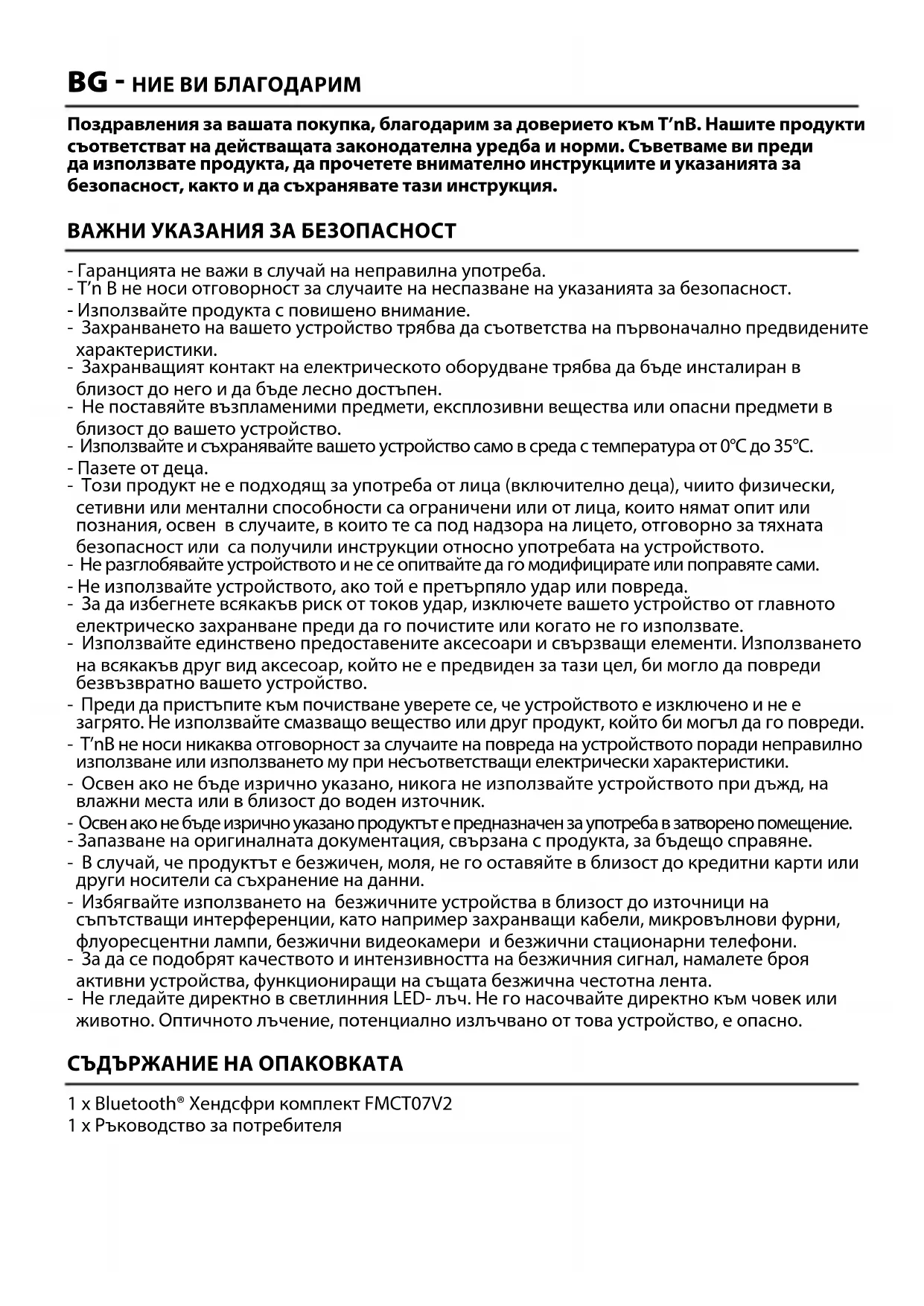 Format muzical MP3/WMA Stick USB (Max) 64GBc) În modul muzică, în cazul unui apel primit, transmițătorul va comuta automat la modul apel. d) Apăsați o dată pe butonul (1) pentru a răspunde și apăsați din nou pentru a închide. e) Apăsați de două ori pe butonul (1) pentru a refuza apelul primit. f) Pentru a reapela ultimul număr, apăsați de două ori pe butonul (1). OPERAȚIUNI AVEŢI NEVOIE DE AJUTOR? Ne preocupă satisfacția clienților noștri, ne puteți contacta la info@t-nb.com. Pentru întreținere, reparații și diverse informații despre acest produs, vizitați site-ul nostru: www.t-nb.com Curent continuu Pentru a menționa pe plăcuţa indicatoare a caracteristicilor tehnice că echipamentul este adecvat numai în cazul curentului continuu; pentru a identica terminale relevante. Operațiune Transmițător FM Pornire/Oprire Conectați transmițătorul FM la priza de brichetă a vehiculului. FMCT07V2 se va porni automat. Redare/Pauză Apăsați o dată pe butonul (1) în modul muzică. Răspundere/Închidere/Refuz/ Reapelare Apăsați o dată pe butonul (1) pentru a răspunde la un apel și din nou pentru a închide. Apăsați de două ori pe butonul (1) pentru a refuza un apel. Când nu sunteți în apel, apăsați de două ori pe butonul (1) pentru a reapela ultimul număr. Reglare volum Apăsați și țineți apăsat butonul (4) pentru a mări volu- mul și butonul (7) pentru a micșora volumul. Schimbare melodie Apăsați butonul (7) pentru a reda melodia anterioară și butonul (4) pentru a reda melodia următoare. Schimbare efect bas Apăsați butonul (9) pentru a mări frecvențele joase. Mod USB/Bluetooth Apăsați și țineți apăsate butoanele (4) și (7) pentru a schimba între modul USB și modul Bluetooth®.BG - НИЕ ВИ БЛАГОДАРИМ Поздравления за вашата покупка, благодарим за доверието към T’nB. Нашите продукти съответстват на действащата законодателна уредба и норми. Съветваме ви преди да използвате продукта, да прочетете внимателно инструкциите и указанията за безопасност, както и да съхранявате тази инструкция. ВАЖНИ УКАЗАНИЯ ЗА БЕЗОПАСНОСТ - Гаранцията не важи в случай на неправилна употреба. - T’n B не носи отговорност за случаите на неспазване на указанията за безопасност. - Използвайте продукта с повишено внимание. - Захранването на вашето устройство трябва да съответства на първоначално предвидените характеристики. - Захранващият контакт на електрическото оборудване трябва да бъде инсталиран в близост до него и да бъде лесно достъпен. - Не поставяйте възпламеними предмети, експлозивни вещества или опасни предмети в близост до вашето устройство. - Използвайте и съхранявайте вашето устройство само в среда с температура от 0°C до 35°C. - Пазете от деца. - Този продукт не е подходящ за употреба от лица (включително деца), чиито физически, сетивни или ментални способности са ограничени или от лица, които нямат опит или познания, освен в случаите, в които те са под надзора на лицето, отговорно за тяхната безопасност или са получили инструкции относно употребата на устройството. - Не разглобявайте устройството и не се опитвайте да го модифицирате или поправяте сами. - Не използвайте устройството, ако той е претърпяло удар или повреда. - За да избегнете всякакъв риск от токов удар, изключете вашето устройство от главното електрическо захранване преди да го почистите или когато не го използвате. - Използвайте единствено предоставените аксесоари и свързващи елементи. Използването на всякакъв друг вид аксесоар, който не е предвиден за тази цел, би могло да повреди безвъзвратно вашето устройство. - Преди да пристъпите към почистване уверете се, че устройството е изключено и не е загрято. Не използвайте смазващо вещество или друг продукт, който би могъл да го повреди. - T’nB не носи никаква отговорност за случаите на повреда на устройството поради неправилно използване или използването му при несъответстващи електрически характеристики. - Освен ако не бъде изрично указано, никога не използвайте устройството при дъжд, на влажни места или в близост до воден източник. - Освен ако не бъде изри