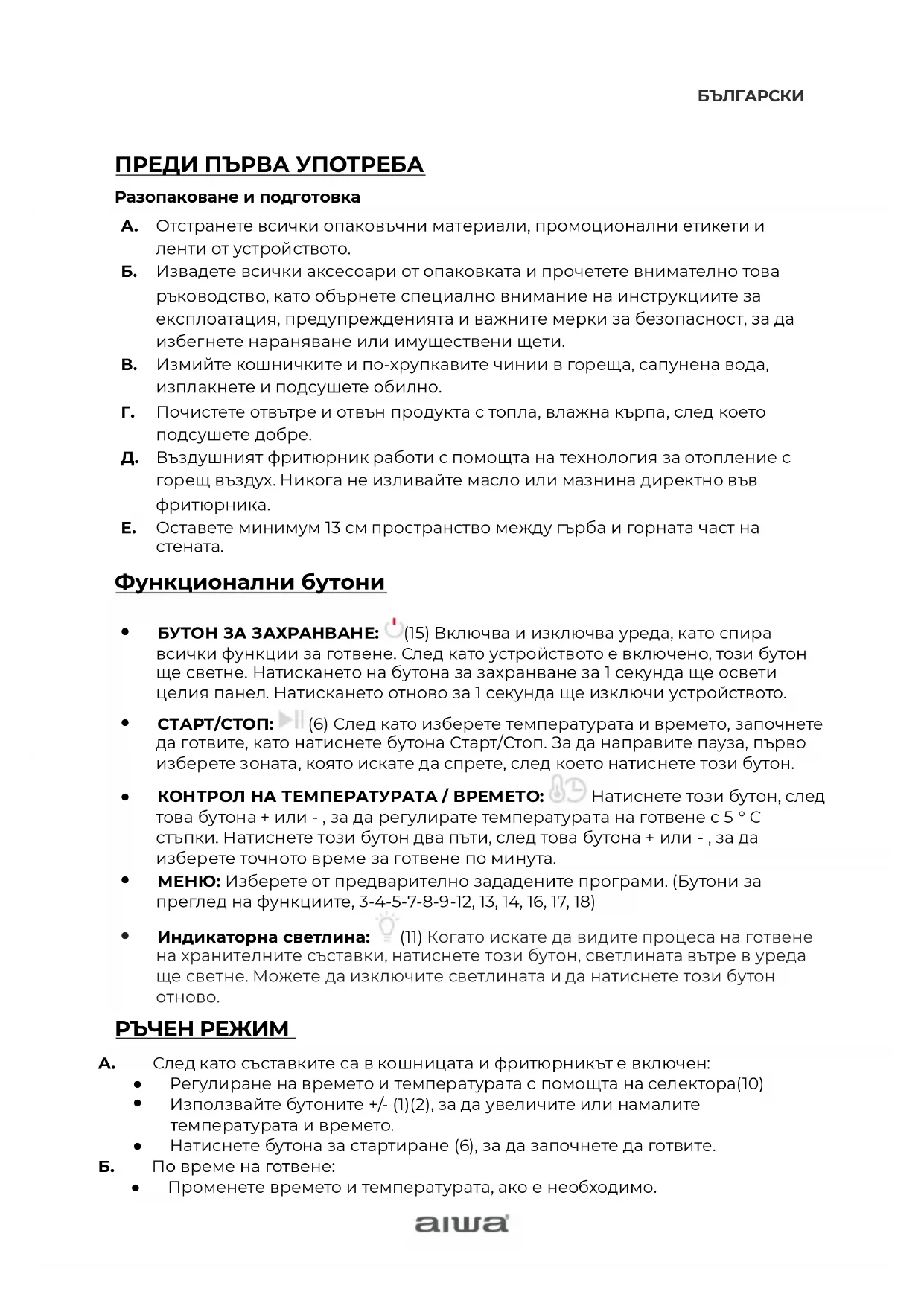 ПРЕДИ ПЪРВА У ПОТРЕБА Разопаковане и подготовка А. Отстранете всички опаковъчни материали, промоционални етикети и ленти от устройството. Б. Извадете всички аксесоари от опаковката и прочетете внимателно това ръководство, като обърнете специално внимание на инструкциите за експлоатация, предупрежденията и важните мерки за безопасност, за да избегнете нараняване или имуществени щети. В. Измийте кошничките и по-хрупкавите чинии в гореща, сапунена вода, изплакнете и подсушете обилно. Г. Почистете отвътре и отвън продукта с топла, влажна кърпа, след което подсушете добре. Д. Въздушният фритюрник работи с помощта на технология за отопление с горещ въздух. Никога не изливайте масло или мазнина директно във фритюрника. Е. Оставете минимум 13 см пространство между гърба и горната част на