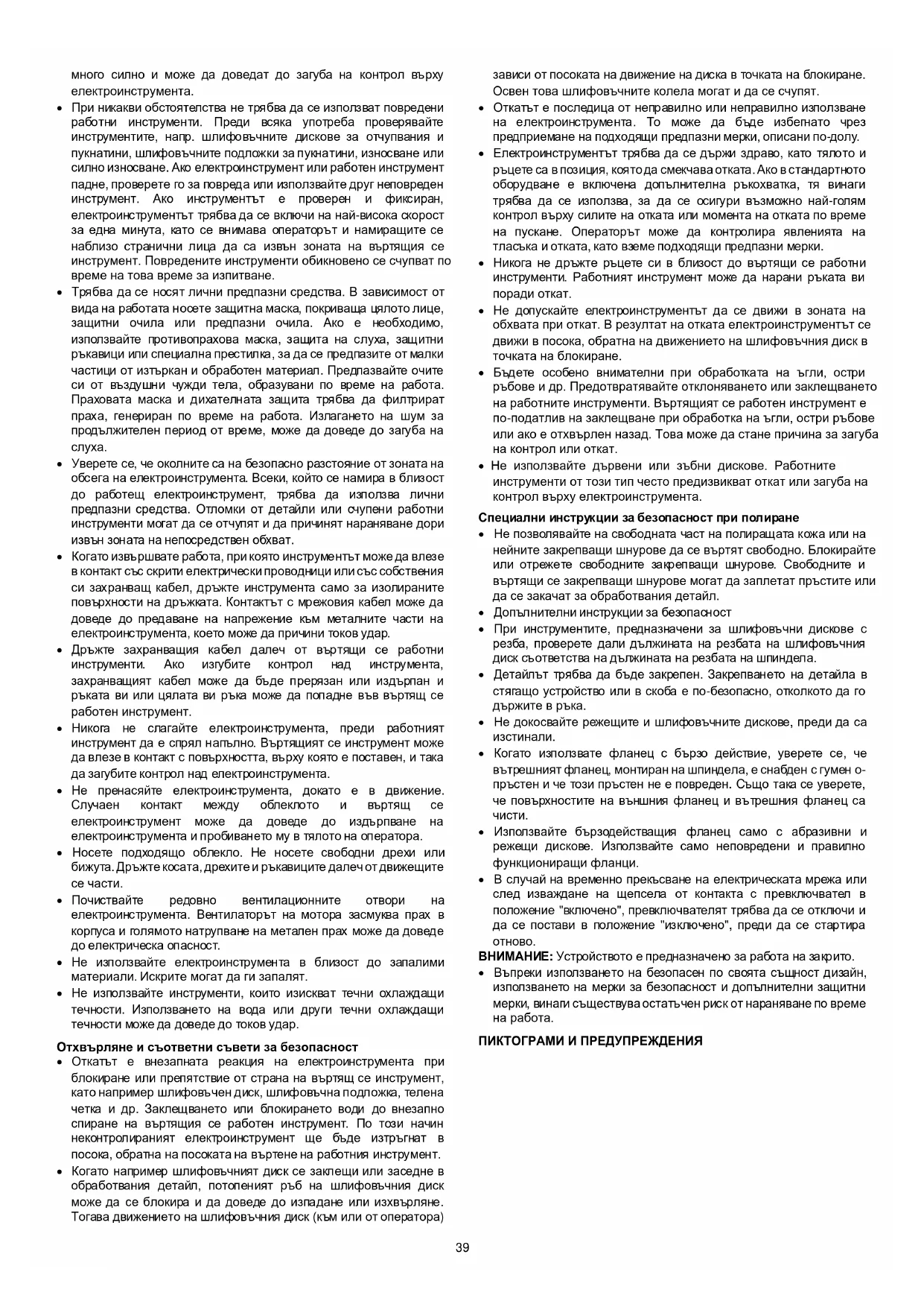 - Не използвайте дървени или зъбни дискове. Работните инструменти от този тип често предизвикват откат или загуба на контрол върху електроинструмента. Специални инструкции за безопасност при полиране