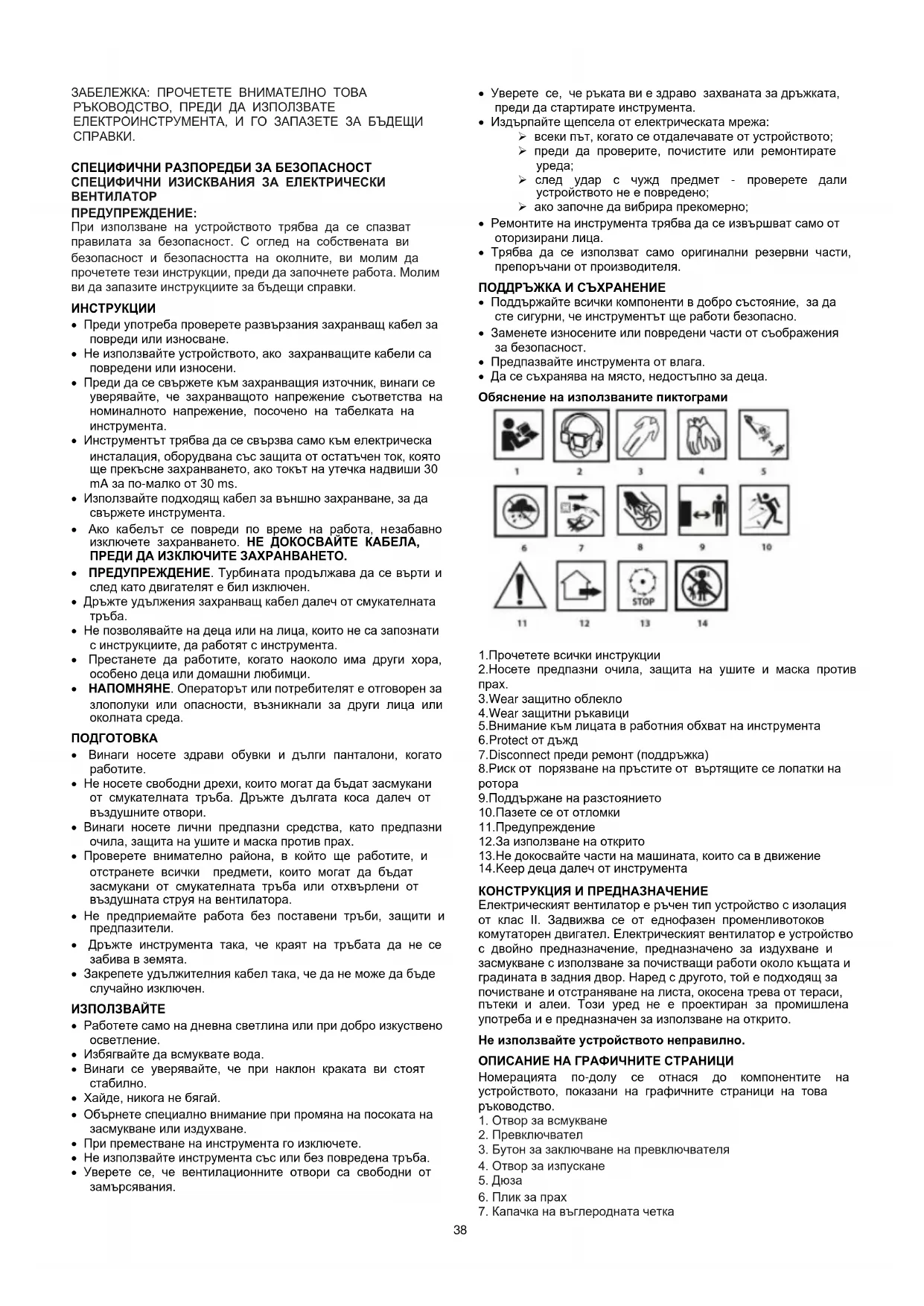 9.Поддържане на разстоянието 10.Пазете се от отломки 11.Предупреждение 12.За използване на открито 13.Не докосвайте части на машината, които са в движение 14.Keep деца далеч от инструмента КОНСТРУКЦИЯ И ПРЕДНАЗНАЧЕНИЕ Електрическият вентилатор е ръчен тип устройство с изолация от клас II. Задвижва се от еднофазен променливотоков комутаторен двигател. Електрическият вентилатор е устройство с двойно предназначение, предназначено за издухване и засмукване с използване за почистващи работи около къщата и градината в задния двор. Наред с другото, той е подходящ за почистване и отстраняване на листа, окосена трева от тераси, пътеки и алеи. Този уред не е проектиран за промишлена употреба и е предназначен за използване на открито. Не използвайте устройството неправилно. ОПИСАНИЕ НА ГРАФИЧНИТЕ СТРАНИЦИ Номерацията по-долу се отнася до компонентите на устройството, показани на графичните страници на това ръководство.