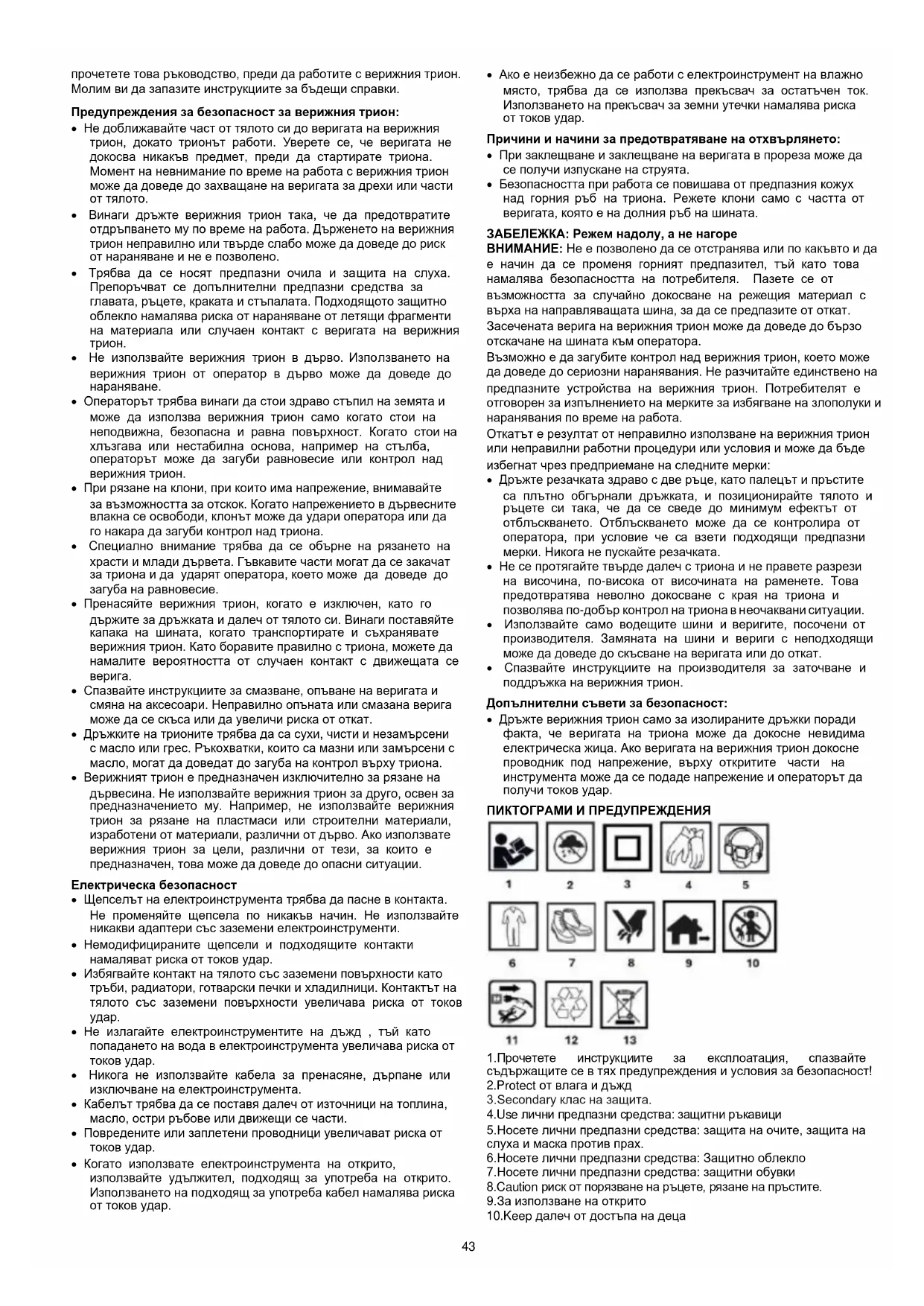 ПРОЧЕТЕТЕ ВНИМАТЕЛНО РЪКОВОДСТВОТО ЗА ПОТРЕБИТЕЛЯ, ЗА ДА СЕ ЗАПОЗНАЕТЕ С УРЕДА ЗАПАЗЕТЕ ТОВА РЪКОВОДСТВО ЗА БЪДЕЩИ СПРАВКИ. ПРАВИЛА ЗА БЕЗОПАСНОСТ Специфични условия за безопасност за акумулаторни верижни триони ПРЕДУПРЕЖДЕНИЕ! При използването на верижния трион трябва да се спазват правилата за безопасност. С оглед на вашата собствена безопасност и безопасността на околните, ви молим да43 прочетете това ръководство, преди да работите с верижния трион. Молим ви да запазите инструкциите за бъдещи справки. Предупреждения за безопасност за верижния трион: