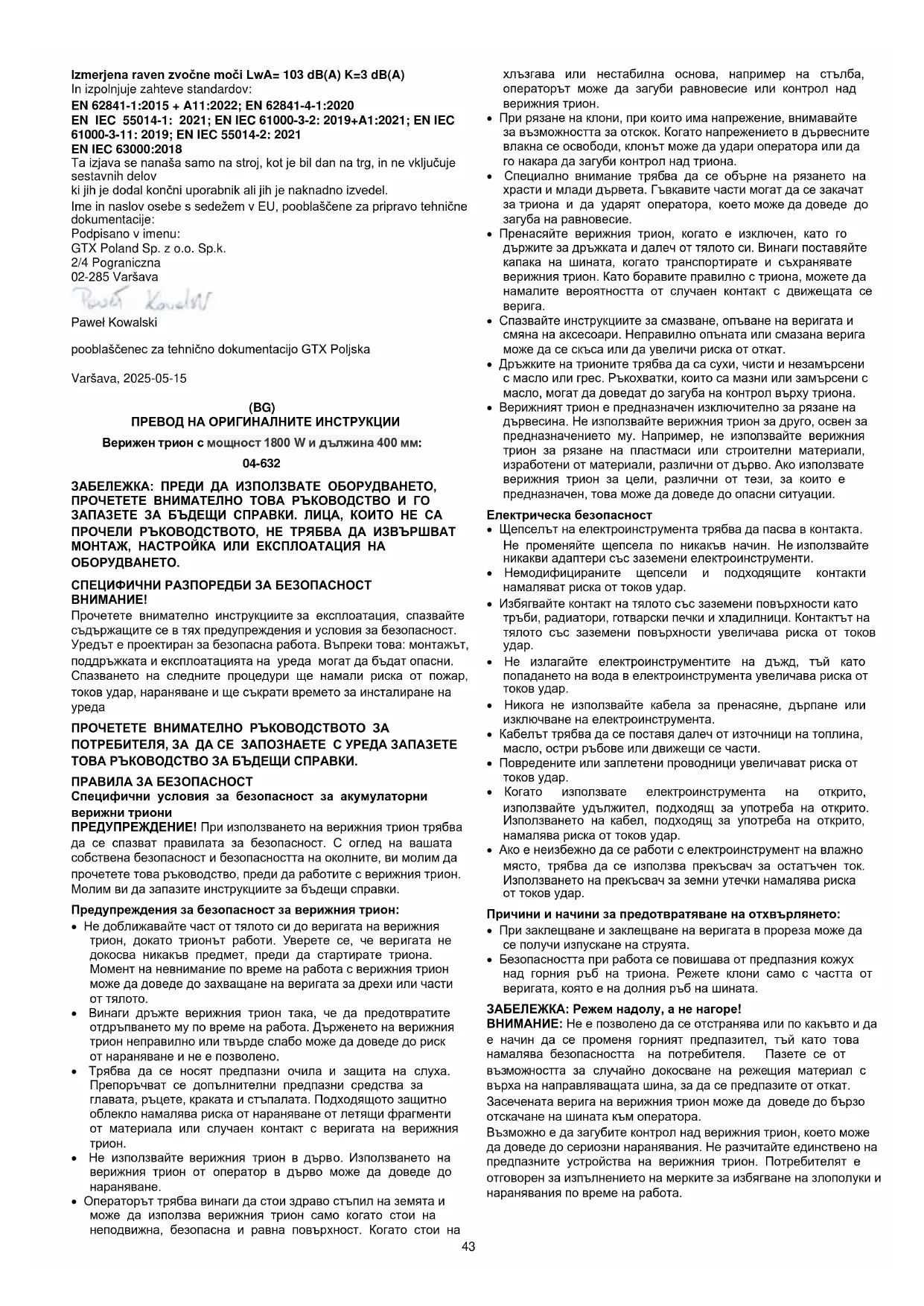 | Стойост на ускореньeto на вибрац ninthе (задна дръжka) | aIF= 2,43 m/s2K=1,5 m/s2 |