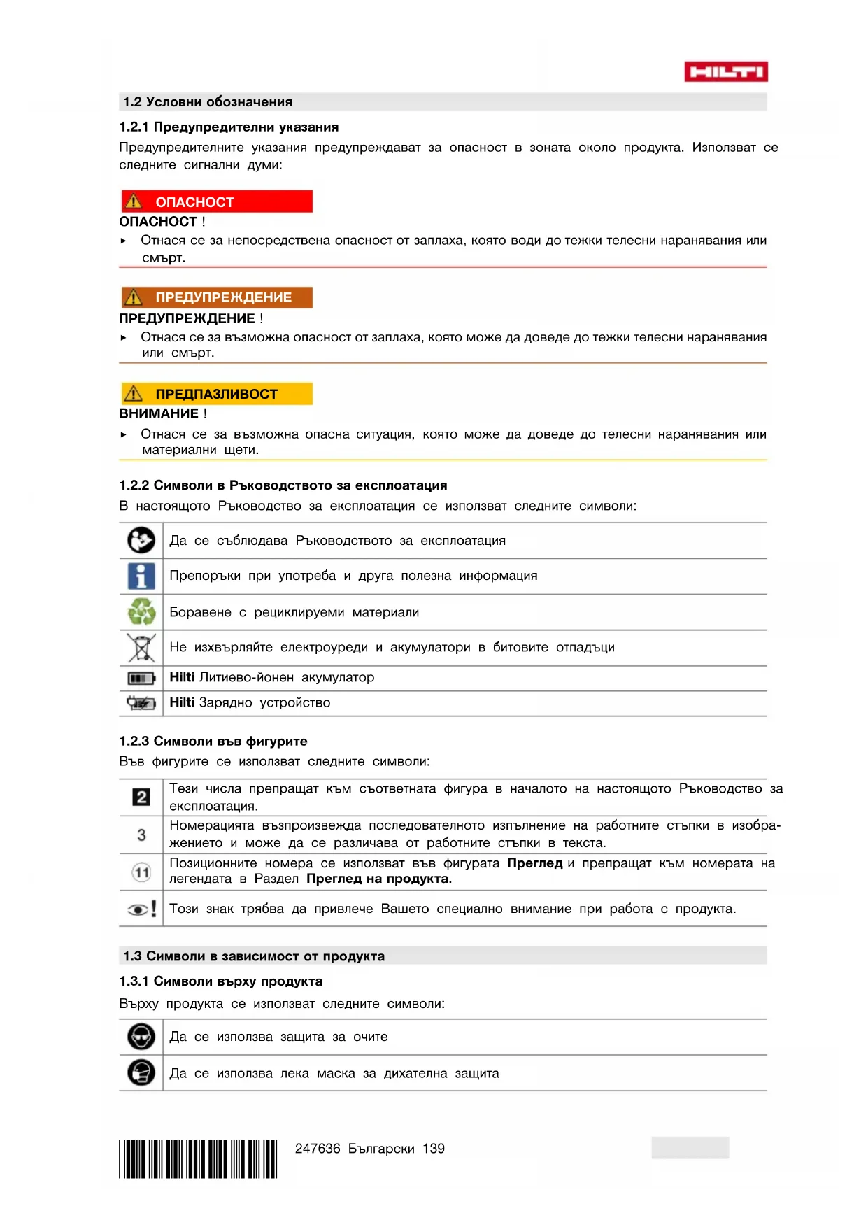 В настоящото Ръководство за експлоатация се използват следните символи: Да се съблюдава Ръководството за експлоатация Препоръки при употреба и друга полезна информация Боравене с рециклируеми материали Не изхвърляйте електроуреди и акумулатори в битовите отпадъци Hilti Литиево-йонен акумулатор Hilti Зарядно устройство