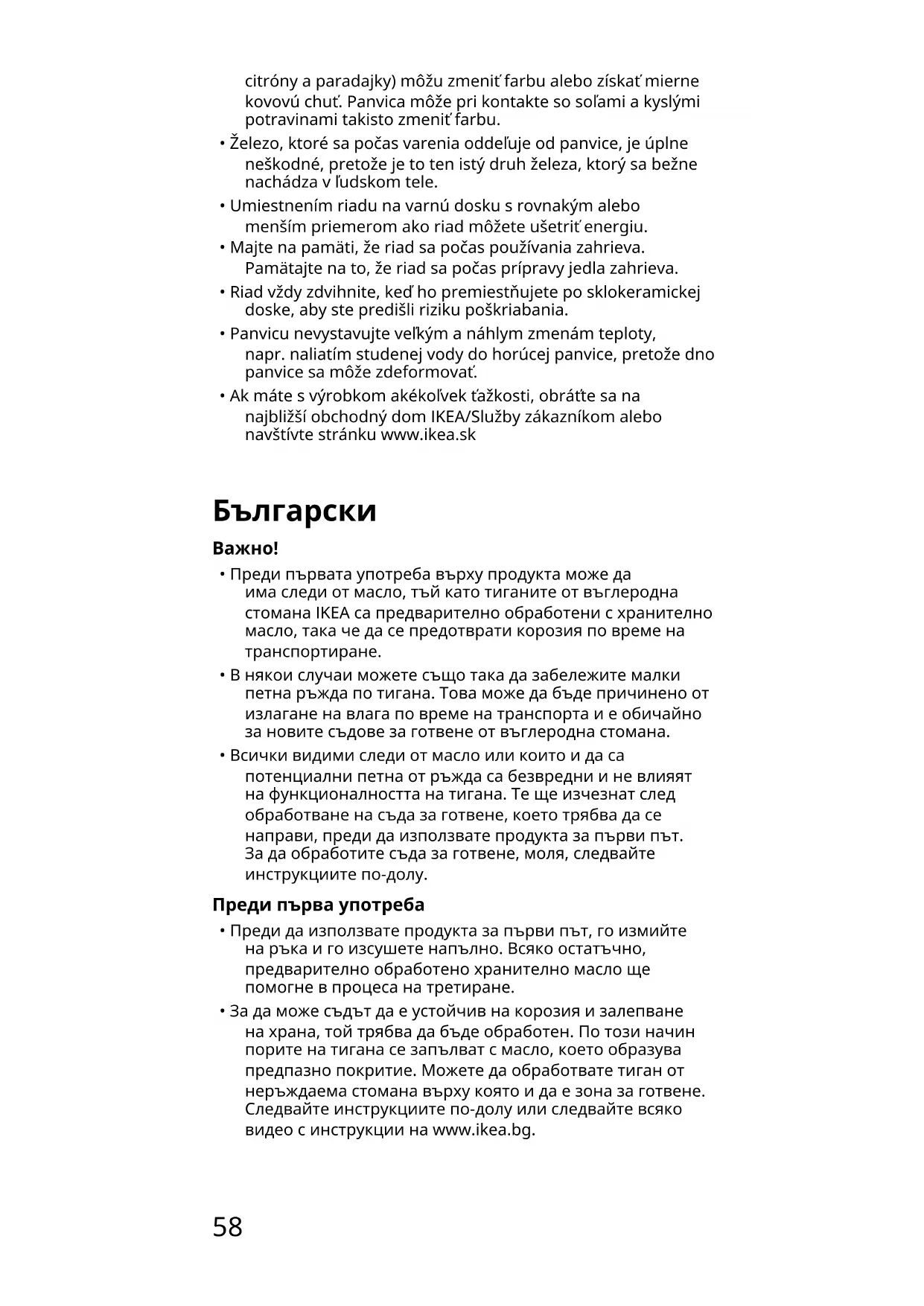 - Преди първата употреба върху продукта може да има следи от масло, тъй като тиганите от въглеродна стомана IKEA са предварително обработени с хранително масло, така че да се предотврати корозия по време на транспортиране.
