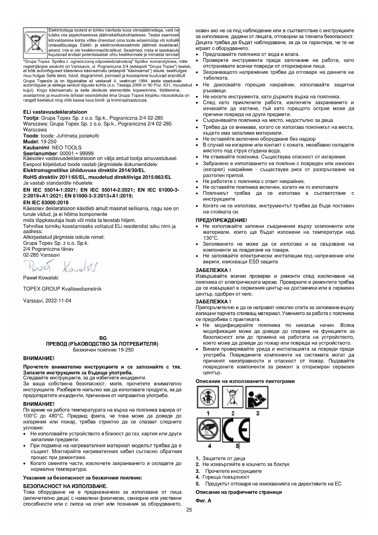 Захранваните с електричество продукти не трябва да се изхвърлят заедно с битовите отпадъци, а да се предават в подходящи съоръжения за изхвърляне. Свържете се с търговеца на продукта или с местните власти за информация относно изхвърлянето. Отпадъците от електрическо и електронно оборудване съдържат вещества, които не са благоприятни за околната среда. Оборудването, което не се рециклира, представлява потенциален риск за околната среда и човешкото здраве. "Grupa Topex Spółka z ograniczoną odpowiedzialnością" Spółka komandytowa със седалище във Варшава, ул. Pograniczna 2/4 (наричана по-нататък "Grupa Topex") информира, че всички авторски права върху съдържанието на това ръководство (наричано по-нататък "Ръководство"), включително, наред с другото. неговия текст, снимки, диаграми, чертежи, както и композицията му, принадлежат изключително на Grupa Topex и са обект на правна защита съгласно Закона от 4 февруари 1994 г. за авторското право и сродните му права (т.е. ДВ, бр. 90 от 2006 г., поз. 631, с измененията). Копирането, обработката, публикуването, модифицирането с търговска цел на цялото Ръководство и на отделните му елементи без съгласието на Grupa Topex, изразено в писмена форма, е строго забранено и може да доведе до гражданска и наказателна отговорност. ЕС декларация за съответствие Производител: Sp.k., Pograniczna 2/4 02-285 Warszawa Продукт: Безжичен поялник Модел: 19-250 Търговско наименование: NEO TOOLS Сериен номер: 00001 ÷ 99999 Настоящата декларация за съответствие се издава на изключителната отговорност на производителя. Продуктът, описан по-горе, съответства на следните документи: Директива 2014/30/ЕС за електромагнитна съвместимост Директива 2011/65/ЕС, изменена с Директива 2015/863/ЕС И отговаря на изискванията на стандартите:27 EN IEC 55014-1:2021; EN IEC 55014-2:2021; EN IEC 61000-3- 2:2019+A1:2021; EN 61000-3-3:2013+A1:2019; EN IEC 63000:2018 Настоящата декларация се отнася само за машината, както е пусната на пазара, и не включва компоненти. добавени от крайния потребител или извършени от него впоследствие. Име и адрес на лицето, пребиваващо в ЕС, упълномощено да изготви техническото досие: Подписано от името на: Grupa Topex Sp. z o.o. Sp.k. Улица Pograniczna 2/4 02-285 Варшава Павел Ковалски Отговорник по качеството на TOPEX GROUP Варшава, 2022-11-04