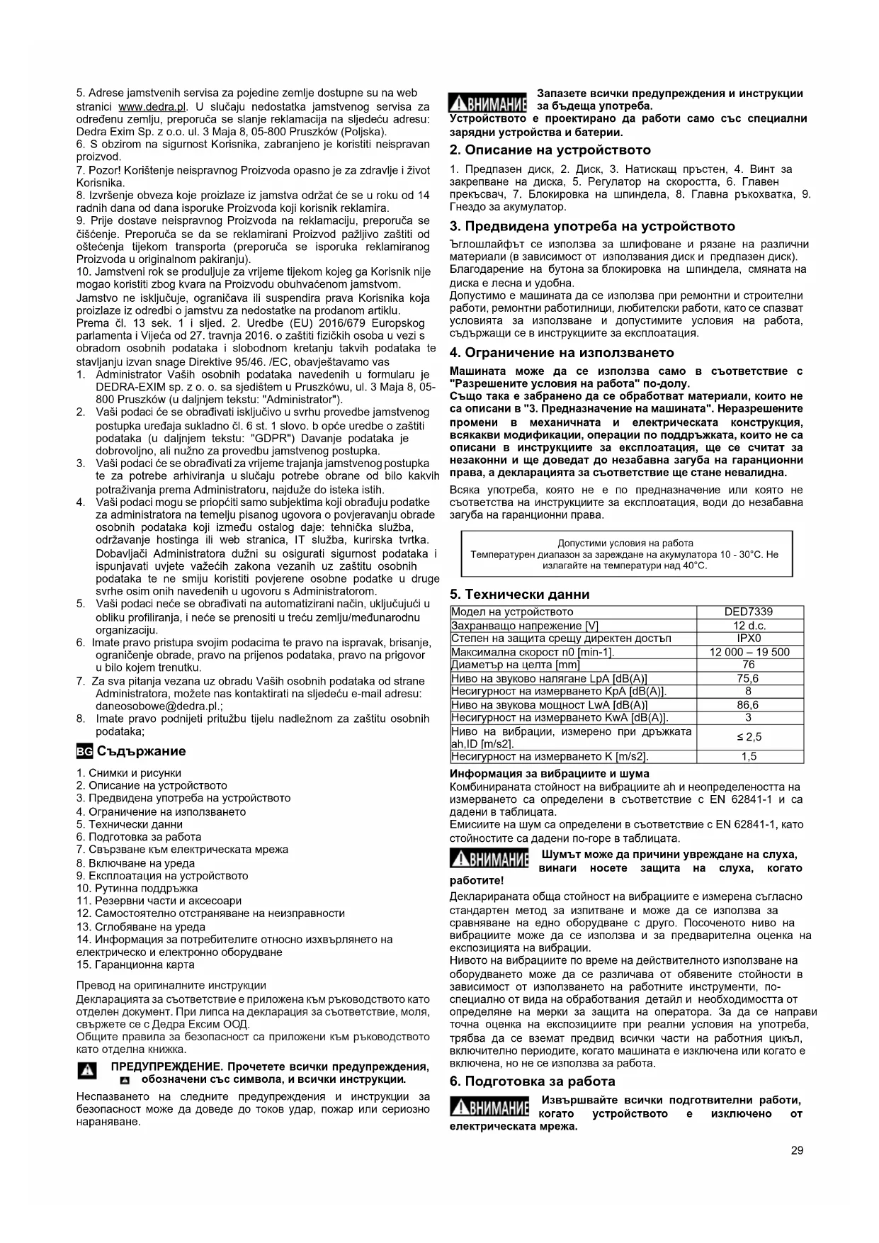 достъпни на www.dedra.pl. Ако в дадена страна няма гаранционно обслужване, препоръчваме да отправяте гаранционни претенции към: „Dedra-Exim” Sp. z o.o. ul. 3 Maja 8, 05-800 Pruszków (Полша).