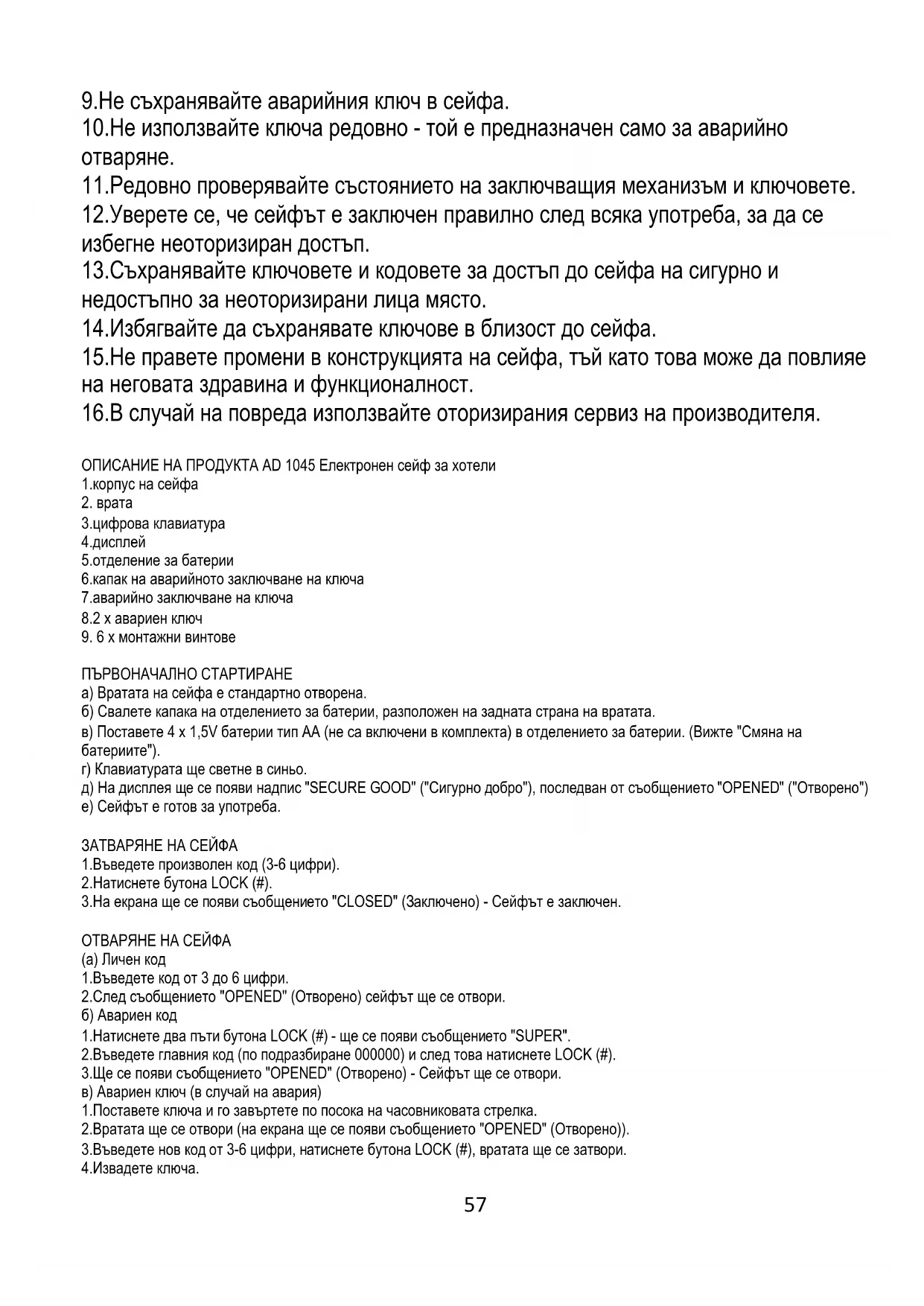 ПЪРВОНАЧАЛНО СТАРТИРАНЕ а) Вратата на сейфа е стандартно отворена. б) Свалете капака на отделението за батерии, разположен на задната страна на вратата. в) Поставете 4 x 1,5V батерии тип АА (не са включени в комплекта) в отделението за батерии. (Вижте "Смяна на батериите"). г) Клавиатурата ще светне в синьо. д) На дисплея ще се появи надпис "SECURE GOOD" ("Сигурно добро"), последван от съобщението "OPENED" ("Отворено") е) Сейфът е готов за употреба. ЗАТВАРЯНЕ НА СЕЙФА 1.Въведете произволен код (3-6 цифри). 2.Натиснете бутона LOCK (#). 3.На екрана ще се появи съобщението "CLOSED" (Заключено) - Сейфът е заключен. ОТВАРЯНЕ НА СЕЙФА (а) Личен код 1.Въведете код от 3 до 6 цифри. 2.След съобщението "OPENED" (Отворено) сейфът ще се отвори. б) Авариен код 1.Натиснете два пъти бутона LOCK (#) - ще се появи съобщението "SUPER". 2.Въведете главния код (по подразбиране 000000) и след това натиснете LOCK (#). 3.Ще се появи съобщението "OPENED" (Отворено) - Сейфът ще се отвори. в) Авариен ключ (в случай на авария) 1.Поставете ключа и го завъртете по посока на часовниковата стрелка. 2.Вратата ще се отвори (на екрана ще се появи съобщението "OPENED" (Отворено)). 3.Въведете нов код от 3-6 цифри, натиснете бутона LOCK (#), вратата ще се затвори. 4.Извадете ключа.58