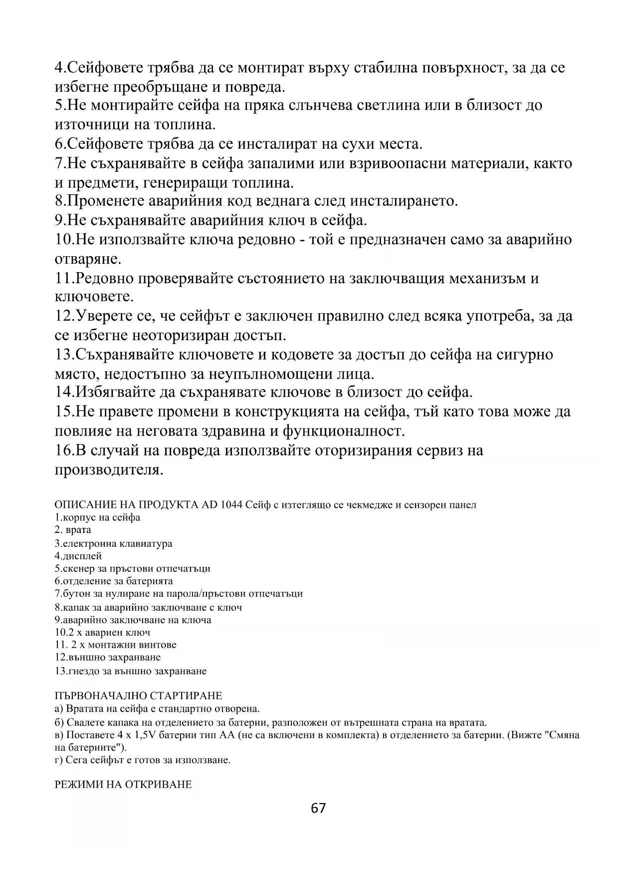 12.външно захранване 13.гнездо за външно захранване ПЪРВОНАЧАЛНО СТАРТИРАНЕ а) Вратата на сейфа е стандартно отворена. б) Свалете капака на отделението за батерии, разположен от вътрешната страна на вратата. в) Поставете 4 x 1,5V батерии тип АА (не са включени в комплекта) в отделението за батерии. (Вижте "Смяна на батериите"). г) Сега сейфът е готов за използване. РЕЖИМИ НА ОТКРИВАНЕ68 1.Пръстов отпечатък 2.Цифрова парола (2-10 цифри) 3.Пръстов отпечатък + парола ОТВАРЯНЕ НА ВРАТАТА С ПАРОЛА ИЛИ ПРЪСТОВ ОТПЕЧАТЪК Докоснете сензорния панел, подсветката ще се включи. Въведете парола от 2-10 цифри и потвърдете с бутона "#". На екрана ще се появи надпис "OPEN" (Отворено), чекмеджето ще се извади автоматично. Поставете регистрирания си пръст директно върху сензора за пръстови отпечатъци, синята светлина ще светне, изчакайте светлината за пръстови отпечатъци да стане зелена, чекмеджето ще се извади автоматично. ОТВАРЯНЕ НА ВРАТАТА С ПАРОЛА + ПРЪСТОВ ОТПЕЧАТЪК Въведете парола от 2-10 цифри, потвърдете с бутона "#" и след това въведете пръстовия си отпечатък. Като алтернатива можете първо да въведете пръстовия си отпечатък и след това да въведете цифровата парола. СМЯНА НА ЛИЧНИЯ ВИ КОД (първоначалната парола е 1234, не се запаметява пръстов отпечатък) Натиснете бутона "*" за 2 секунди. На екрана ще се покаже "SET". Въведете първоначалната парола 1234 или зададената от вас парола, натиснете бутона "#" за потвърждение. (Ако електронното заключване е в режим парола + пръстов отпечатък, тогава трябва да се въведе допълнително валиден пръстов отпечатък). Натиснете бутона "0", за да превключите менюто, на екрана ще се покаже "SET-PD", натиснете "#" за потвърждение. На екрана се извежда "BEGIN", въведете нова парола, натиснете бутон "#" за потвърждение (паролата може да бъде дълга от 2 до 10 цифри), на екрана се извежда "AGAIN", въведете отново новата парола. Натиснете бутона "#" за потвърждение и на екрана се появява "DONE" (Извършено), което показва успешна операция. (Паролите, въведени първия и втория път, трябва да са еднакви. В противен случай ще се появи съобщение за