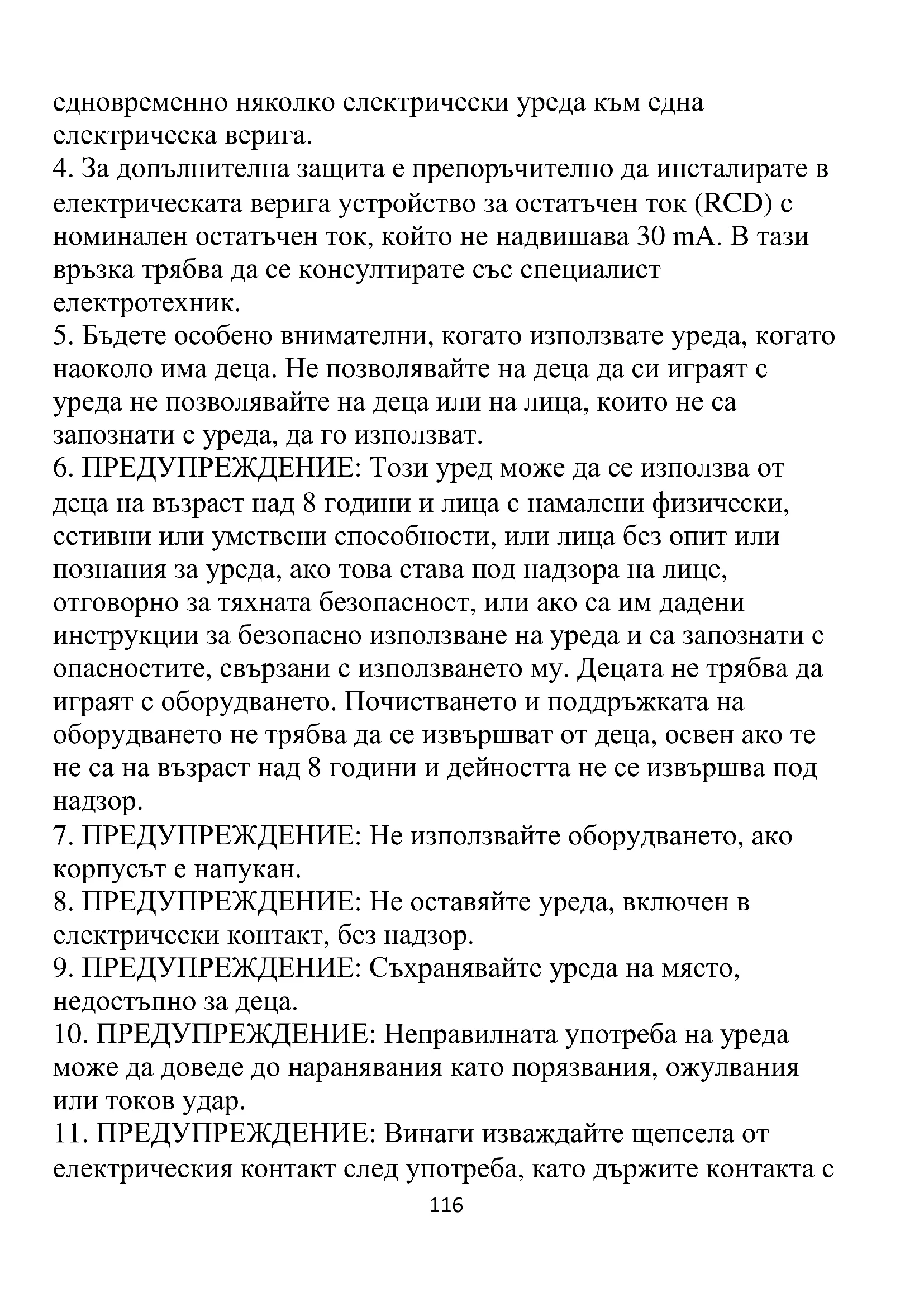 60Hz. За да повишите безопасността на употреба, не свързвайте116 едновременно няколко електрически уреда към една електрическа верига.