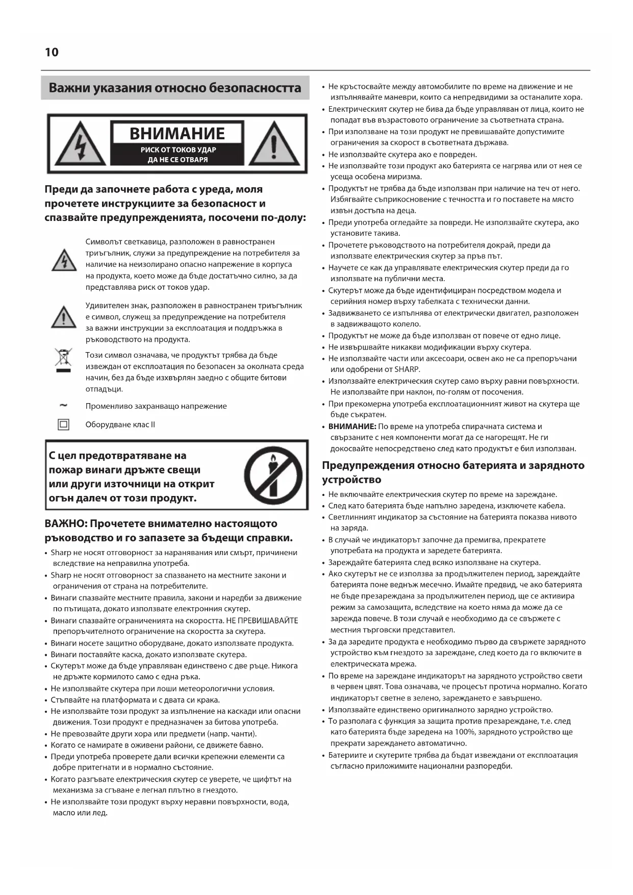 - Sharp не носят отговорност за наранявания или смърт, причинени вследствие на неправилна употреба.• Sharp не носят отговорност за спазването на местните закони и ограничения от страна на потребителите.• Винаги спазвайте местните правила, закони и наредби за движение по пътищата, докато използвате електронния скутер.• Винаги спазвайте ограниченията на скоростта. НЕ ПРЕВИШАВАЙТЕ препоръчителното ограничение на скоростта за скутера.• Винаги носете защитно оборудване, докато използвате продукта.• Винаги поставяйте каска, докато използвате скутера.• Скутерът може да бъде управляван единствено с две ръце. Никога не дръжте кормилото само с една ръка.• Не използвайте скутера при лоши метеорологични условия.• Стъпвайте на платформата и с двата си крака.• Не използвайте този продукт за изпълнение на каскади или опасни движения. Този продукт е предназначен за битова употреба.• Не превозвайте други хора или предмети (напр. чанти).• Когато се намирате в оживени райони, се движете бавно.• Преди употреба проверете дали всички крепежни елементи са добре притегнати и в нормално състояние.• Когато разгъвате електрическия скутер се уверете, че щифтът на механизма за сгъване е легнал плътно в гнездото.• Не използвайте този продукт върху неравни повърхности, вода, масло или лед.• Не кръстосвайте между автомобилите по време на движение и не изпълнявайте маневри, които са непредвидими за останалите хора.• Електрическият скутер не бива да бъде управляван от лица, които не попадат във възрастовото ограничение за съответната страна.• При използване на този продукт не превишавайте допустимите ограничения за скорост в съответната държава.• Не използвайте скутера ако е повреден.• Не използвайте този продукт ако батерията се нагрява или от нея се усеща особена миризма.• Продуктът не трябва да бъде използван при наличие на теч от него. Избягвайте съприкосновение с течността и го поставете на място извън достъпа на деца.• Преди употреба огледайте за повреди. Не използвайте скутера, ако установите такива.• Прочетете ръководството на потребителя докрай, преди да използвате електрическия скутер за пръв път.• Научете се как да управлявате електрическия скутер преди да го използвате на публични места.• Скутерът може да бъде идентифициран посредством модела и серийния номер върху табелката с технически данни.• Задвижването се изпълнява от електрически двигател, разположен взадвижващото колело.• Продуктът не може да бъде използван от повече от едно лице.• Не извършвайте никакви модификации върху скутера.• Не използвайте части или аксесоари, освен ако не са препоръчани или одобрени от SHARP.• Използвайте електрическия скутер само върху равни повърхности. Не използвайте при наклон, по-голям от посочения.• При прекомерна употреба експлоатационният живот на скутера ще бъде съкратен.• ВНИМАНИЕ: По време на употреба спирачната система и свързаните с нея компоненти могат да се нагорещят. Не ги докосвайте непосредствено след като продуктът е бил използван. Предупреждения относно батерията и зарядното