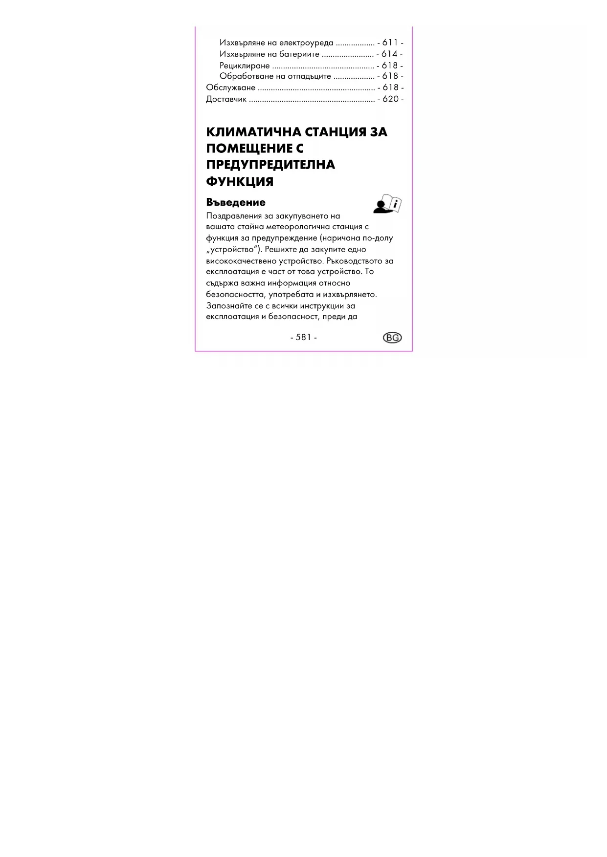 Поздравления за закупуването на вашата стайна метеорологична станция с функция за предупреждение (наричана по-долу „устройство“). Решихте да закупите едно висококачествено устройство. Ръководството за експлоатация е част от това устройство. То съдържа важна информация относно безопасността, употребата и изхвърлянето. Запознайте се с всички инструкции за експлоатация и безопасност, преди да- 582 - използвате устройството. Използвайте устройството само както е описано и за посочените области на приложение. Предайте всички документи, когато предавате устройството на трети лица. Запазете опаковката и ръководството за експлоатация за по-късни запитвания. Предназначение Устройството е подходящо за използване на описаните функции. Всяка друга употреба или модификация на устройството се счита за несъобразена според предназначението. Производителят не носи отговорност за щети, причинени от несъобразена според предназначението употреба или неправилна експлоатация. Устройството не е предназначено за търговска употреба. Включени в доставката: Забележка: Проверете съдържанието на доставката след покупката. Уверете се, че всички части са налични и не са дефектни. Ако доставката е непълна и/или частите са повредени, не използвайте устройството.- 583 - Свържете се със сервиза (вижте „Обработка в случай на рекламация по гаранцията“). 1 х стайна метеорологична станция 2 х 1,5 V AAA LR03 батерии 1 x Ръководство за експлоатация Технически спецификации Обхват на измерване/температура: 0°C – 50°C Обхват на измерване/влажност: 20 % – 95 % Показание за температурата/толеранс в основния обхват на измерване: +/- 1°C Показание за влажността/толеранс в основния обхват на измерване: 41% – 80% – ±3%; друг диапазон: ±5% Размери: приблизително 115 x 74 x 24 mm