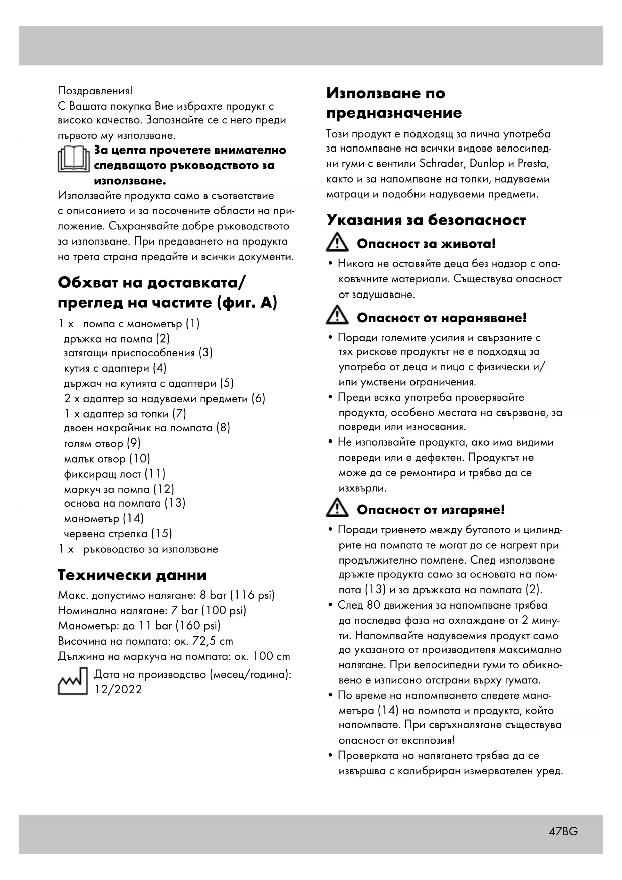 - По време на напомпването следете мано- метъра (14) на помпата и продукта, който напомпвате. При свръхналягане съществува опасност от експлозия!