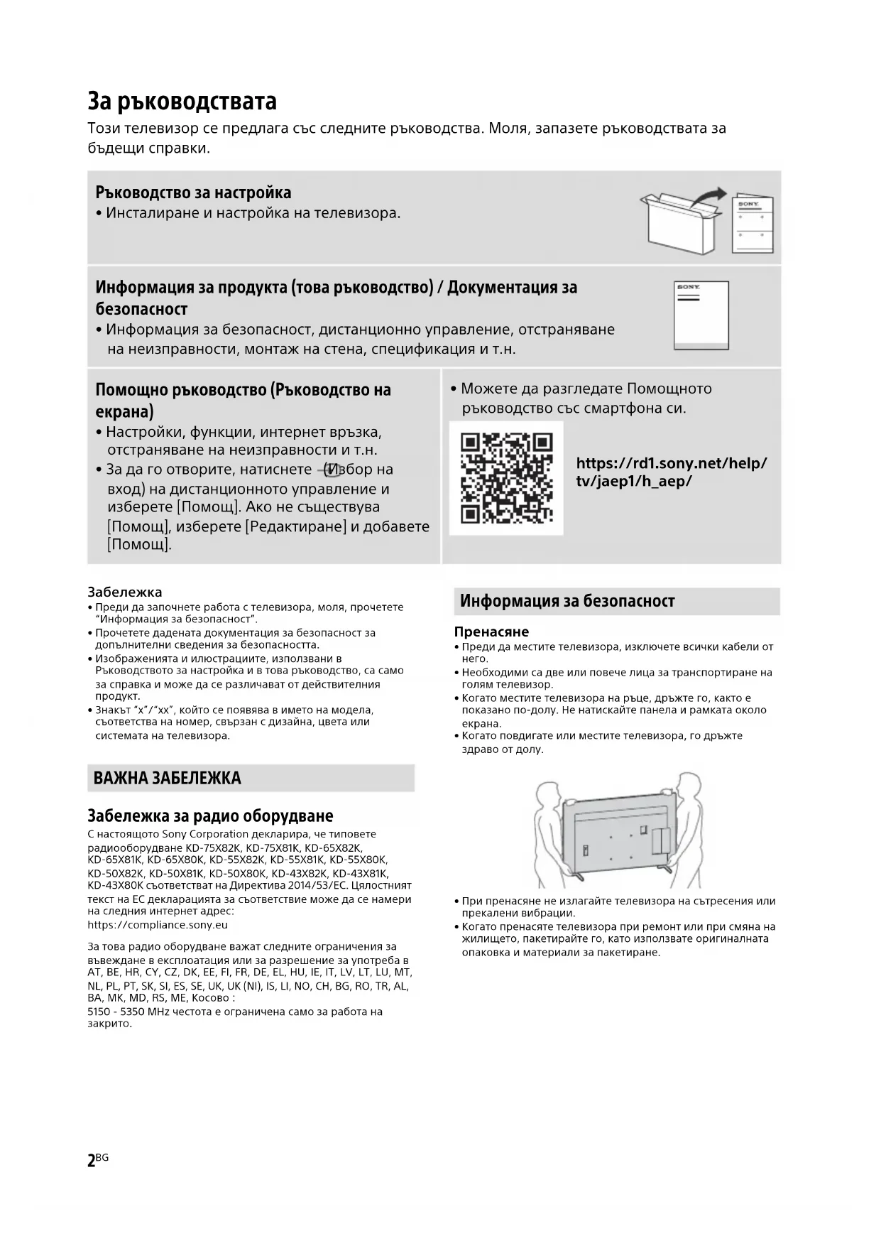 - Можете да разгледате Помощното ръководство със смартфона си. https://rd1.sony.net/help/ tv/jaep1/h_aep/ ВАЖНА ЗАБЕЛЕЖКА Информация за безопасност3