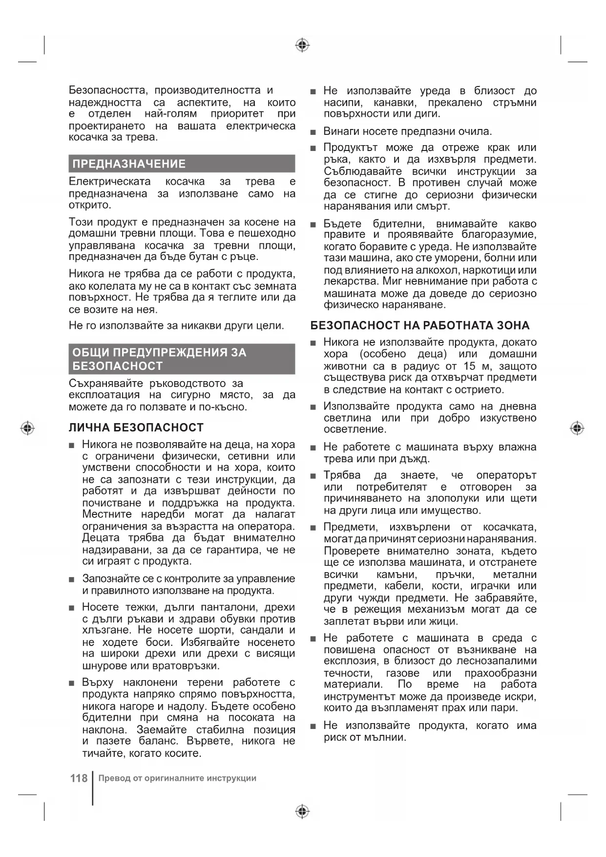 Pripojte do elektrickej zásuvky Odpojte z elektrickej zásuvky Diely alebo príslušenstvo predávané samostatne Poznámka Varovanie Zastavte zariadenie.118 Превод от оригиналните инструкции Безопасността, производителността и надеждността са аспектите, на които е отделен най-голям приоритет при проектирането на вашата електрическа косачка за трева. ПРЕДНАЗНАЧЕНИЕ Електрическата косачка за трева е предназначена за използване само на
