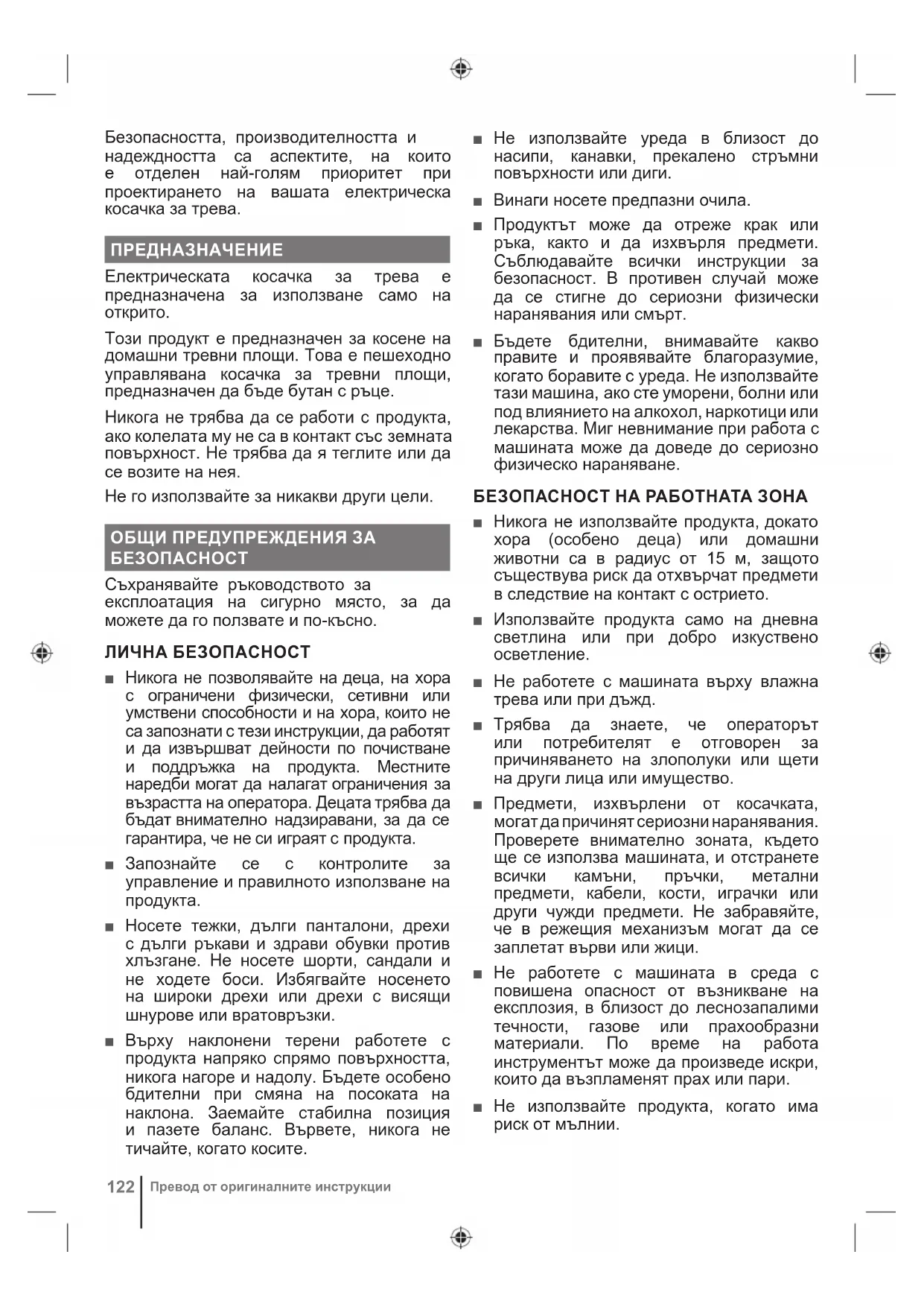 Не работете с продукта по наклони над 15°. Косете наклонените повърхности напряко, никога нагоре и надолу. Не излагайте на дъжд и на влажни условия. Внимавайте с острите остриета. След изключване на двигателя остриетата продължават да се въртят. Извадете щепсела от електрическата мрежа преди профилактика или ако кабелът е повреден. Внимавайте за изхвърлени или летящи обекти. Близкостоящите, особено деца и домашни любимци, трябва да стоят поне на 15 m от зоната на работа.БЪЛГАРИЯ