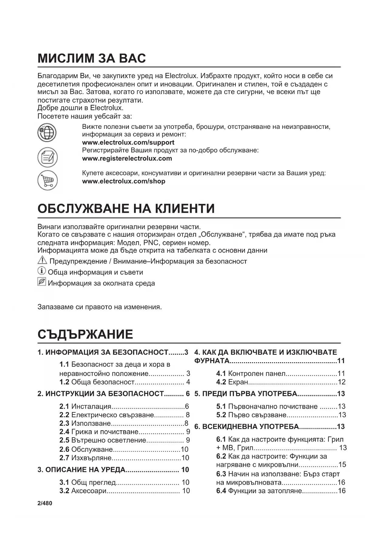 UKМИСЛИМ ЗА ВАС Благодарим Ви, че закупихте уред на Electrolux. Избрахте продукт, който носи в себе си десетилетия професионален опит и иновации. Оригинален и стилен, той е създаден с мисъл за Вас. Затова, когато го използвате, можете да сте сигурни, че всеки път ще постигате страхотни резултати. Добре дошли в Electrolux. Посетете нашия уебсайт за: Вижте полезни съвети за употреба, брошури, отстраняване на неизправности, информация за сервиз и ремонт: www.electrolux.com/support Регистрирайте Вашия продукт за по-добро обслужване: www.registerelectrolux.com Купете аксесоари, консумативи и оригинални резервни части за Вашия уред: www.electrolux.com/shop ОБСЛУЖВАНЕ НА КЛИЕНТИ Винаги използвайте оригинални резервни части. Когато се свързвате с нашия оторизиран отдел „Обслужване“, трябва да имате под ръка следната информация: Модел, PNC, сериен номер. Информацията може да бъде открита на табелката с основни данни Предупреждение / Внимание–Информация за безопасност Обща информация и съвети Информация за околната среда Запазваме си правото на изменения.