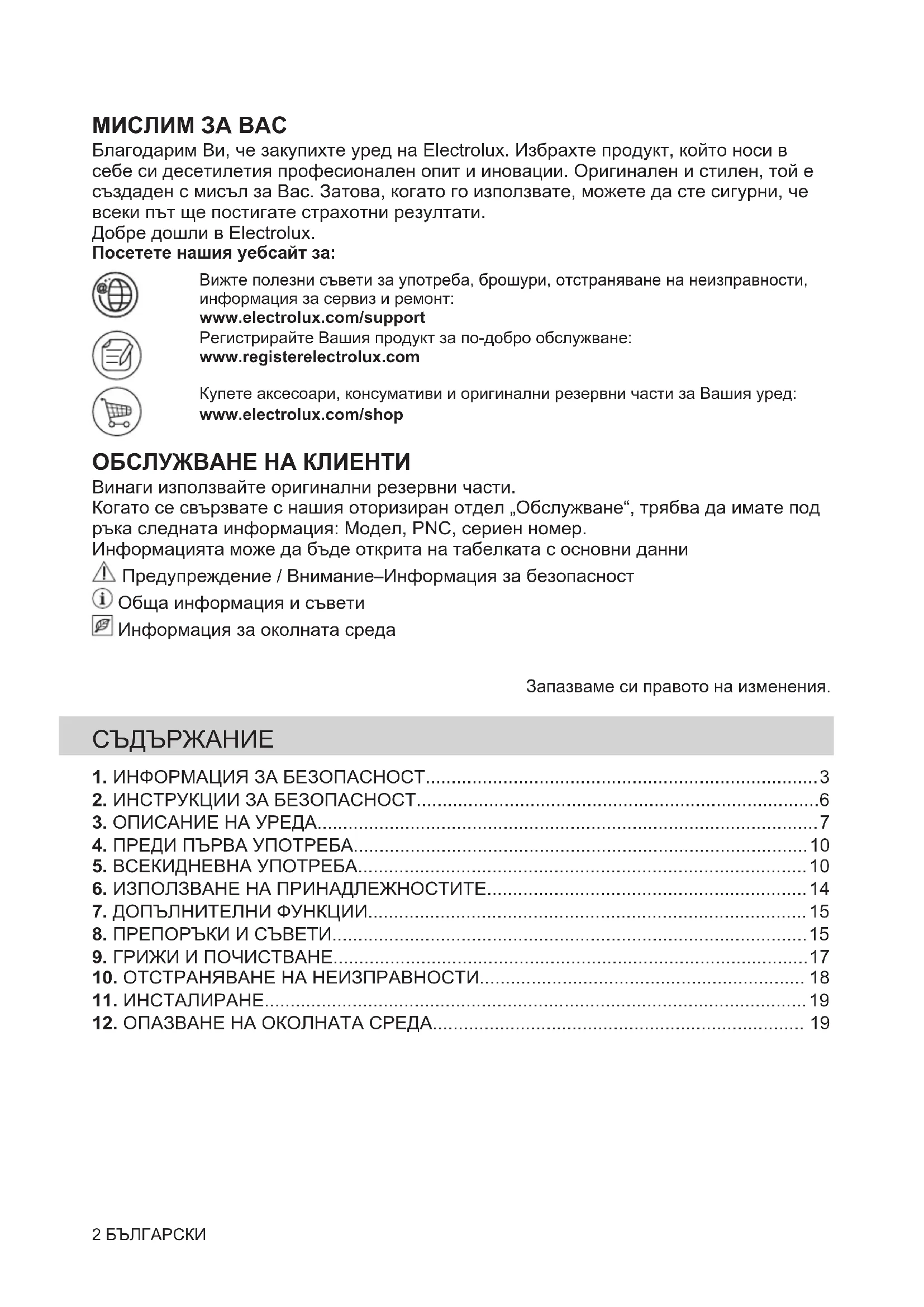 283МИСЛИМ ЗА ВАС Благодарим Ви, че закупихте уред на Electrolux. Избрахте продукт, който носи в себе си десетилетия професионален опит и иновации. Оригинален и стилен, той е създаден с мисъл за Вас. Затова, когато го използвате, можете да сте сигурни, че всеки път ще постигате страхотни резултати. Добре дошли в Electrolux. Посетете нашия уебсайт за: Вижте полезни съвети за употреба, брошури, отстраняване на неизправности, информация за сервиз и ремонт: www.electrolux.com/support Регистрирайте Вашия продукт за по-добро обслужване: www.registerelectrolux.com Купете аксесоари, консумативи и оригинални резервни части за Вашия уред: www.electrolux.com/shop ОБСЛУЖВАНЕ НА КЛИЕНТИ Винаги използвайте оригинални резервни части. Когато се свързвате с нашия оторизиран отдел „Обслужване“, трябва да имате под ръка следната информация: Модел, PNC, сериен номер. Информацията може да бъде открита на табелката с основни данни Предупреждение / Внимание–Информация за безопасност Обща информация и съвети Информация за околната среда Запазваме си правото на изменения.