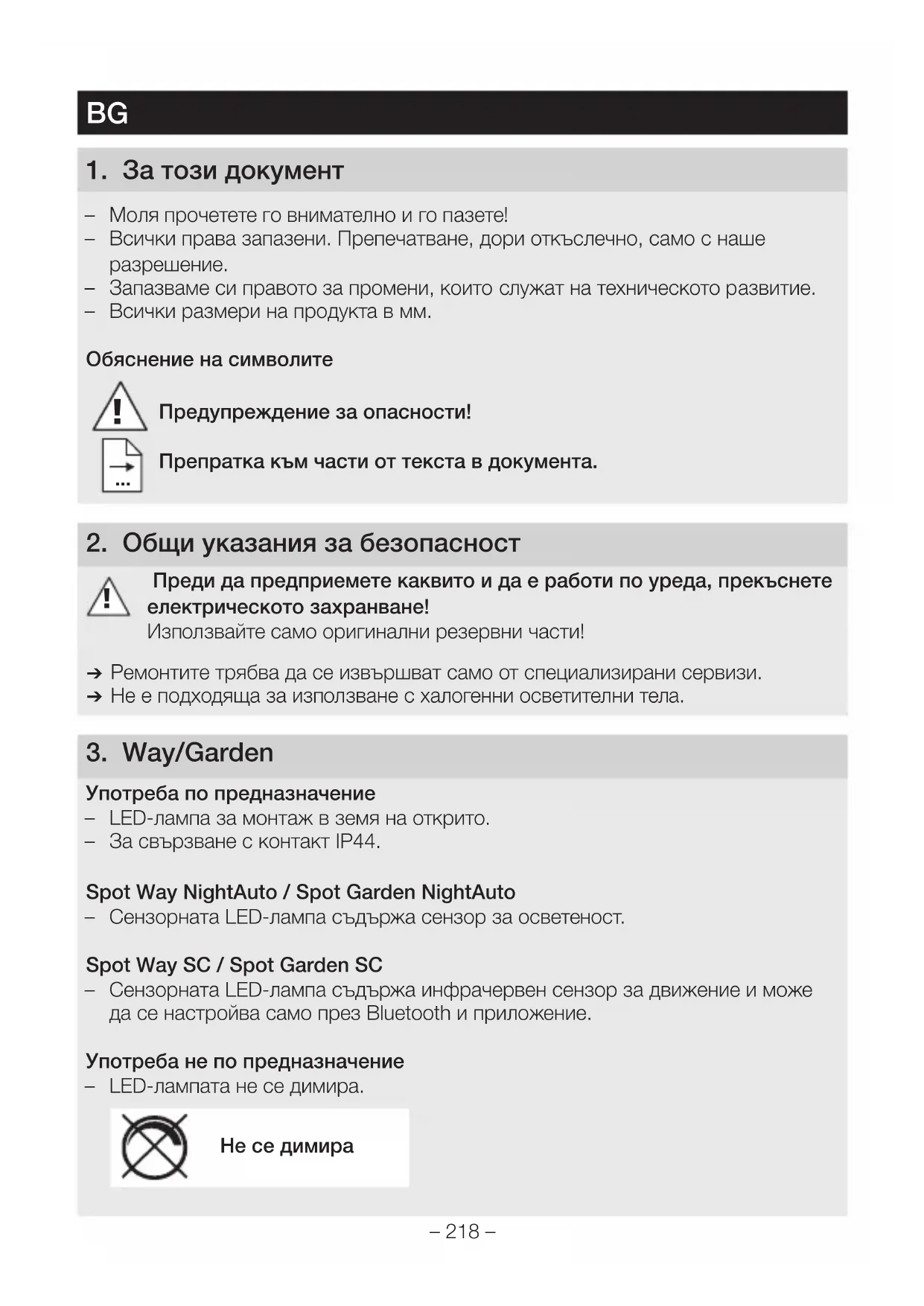 Употреба по предназначение – LED-лампа за монтаж в земя на открито. – За свързване с контакт IP44. Spot Way NightAuto/Spot Garden NightAuto – Сензорната LED-лампа съдържа сензор за осветеност. Spot Way SC/Spot Garden SC – Сензорната LED-лампа съдържа инфрачервен сензор за движение и може да се настройва само през Bluetooth и приложение. Употреба не по предназначение – LED-лампата не се димира. Не се димира– 219 – Съдържание на комплекта Spot Way (рис. 3.1) – лампа вкл. колона, подова платка и сързващ кабел с щепсел – три винта – три дюбела Съдържание на комплекта Spot Garden (рис. 3.2) – лампа вкл. сързващ кабел с щепсел – стойка-шиш – два винта Размери на продукта Spot Way (рис. 3.3) Размери на продукта Spot Garden (рис. 3.4) Преглед на продукта (рис. 3.5 – 3.10) A Корпус на лампата B датчик за движение (само Spot Way/Garden SC) C сензор за осветеност (само Spot Way/Garden NightAuto) D настройка на светлочувствителността (само Spot Way/GardenNightAuto) E колона с подова платка (само Spot Way) F стойка-шиш (само Spot Garden) G мрежов кабел с щепсел Област на засичане Spot Way/Garden SC (рис. 3.11 – 3.16) Разпределение на светлината (рис. 3.17)