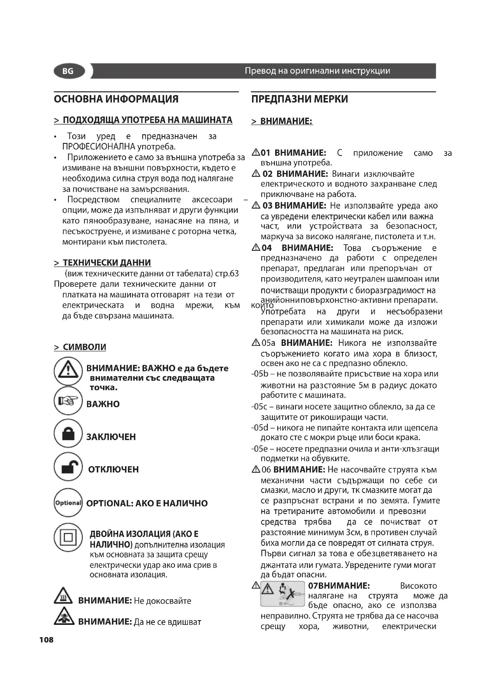 07ВНИМАНИЕ: Високото налягане на струята може да бъде опасно, ако се използва неправилно. Струята не трябва да се насочва срещу хора, животни, електрически Превод на оригинални инструкции
