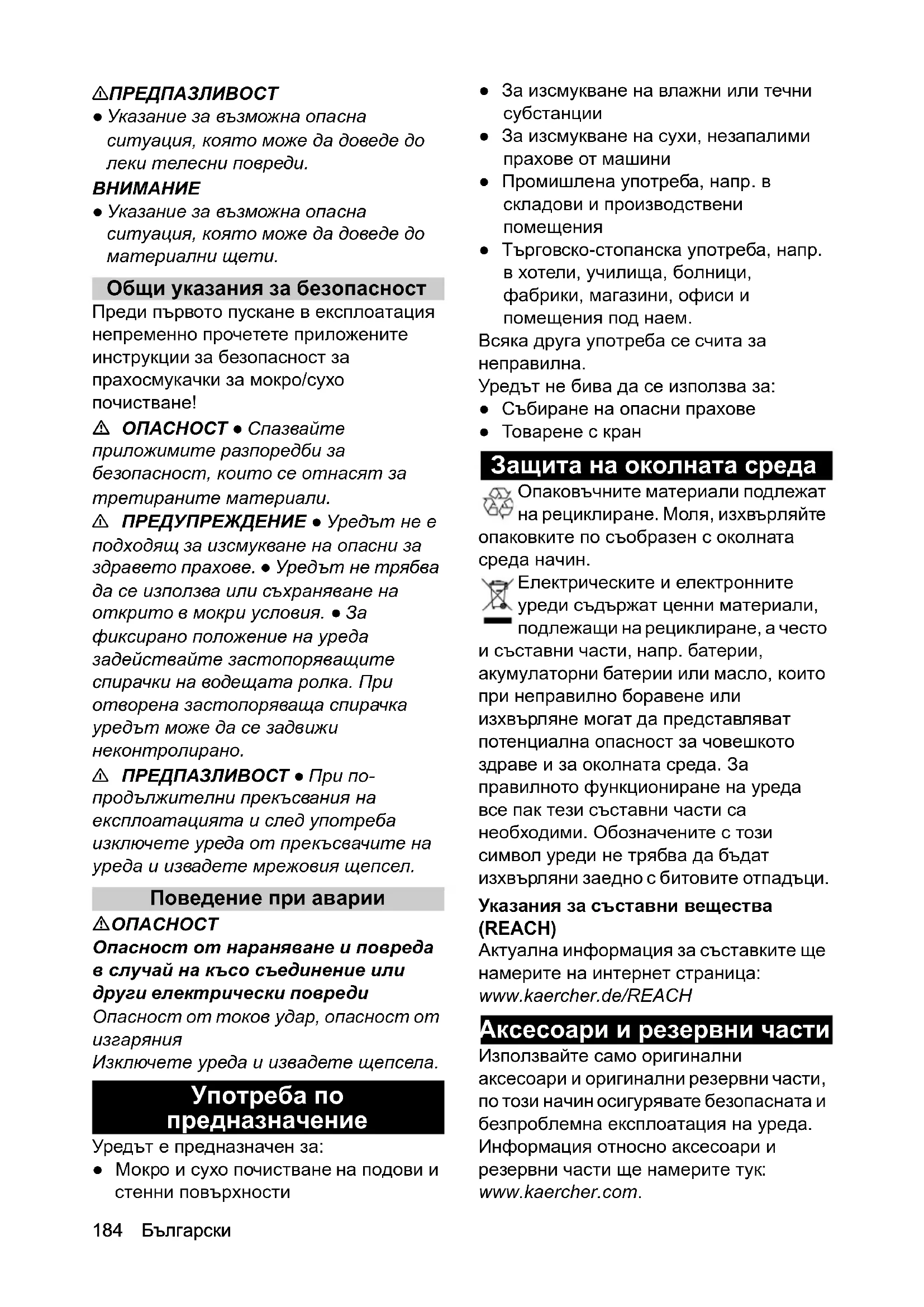 ● Указание за възможна опасна ситуация, която може да доведе до материални щети. Общи указания за безопасност Преди първото пускане в експлоатация непременно прочетете приложените инструкции за безопасност за прахосмукачки за мокро/сухо почистване! ОПАСНОСТ ● Спазвайте приложимите разпоредби за безопасност, които се отнасят за третираните материали. 몇 ПРЕДУПРЕЖДЕНИЕ ● Уредът не е подходящ за изсмукване на опасни за здравето прахове. ● Уредът не трябва да се използва или съхраняване на открито в мокри условия. ● За фиксирано положение на уреда задействайте застопоряващите спирачки на водещата ролка. При отворена застопоряваща спирачка уредът може да се задвижи неконтролирано. 몇 ПРЕДПАЗЛИВОСТ ● При по- продължителни прекъсвания на експлоатацията и след употреба изключете уреда от прекъсвачите на уреда и извадете мрежовия щепсел. Поведение при аварии