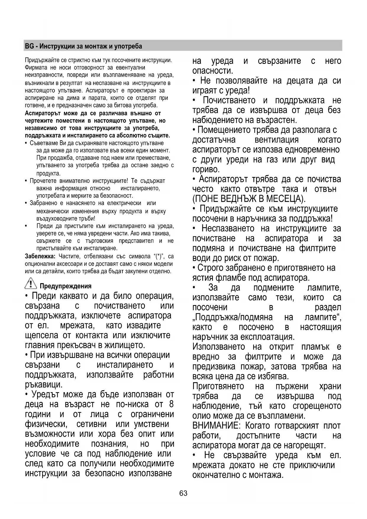 Напрежението в ел.мрежата трябва да отговаря на напрежението, което е посочено върху етикета с данните за аспиратора, поставен от вътрешната му страна. Ако е снабден с щепсел свържете аспиратора към контакт, съответстващ на действащите норми и намиращ се на лесно достъпно място дори и след приключване на монтажа. Ако не е снабден с щепсел (директно свързване към мрежата), или щепселът не е на достъпно място след приключване на монтажа, използвайте двуполюсен прекъсвач според нормите, така че да се осигури пълно изключване на мрежата при свръхнапрежение ІІІ, в съответствие с правилата за монтиране. ВНИМАНИЕ! Преди да свържете отново аспиратора към мрежата и да проверите дали функционира правилно, проверете дали кабелът е монтиран както трябва. ВНИМАНИЕ! Подмяната на захранващия кабел трябва да се извършва от оторизирания сервиз за66 техническа помощ, за да се избегне всякакъв риск.