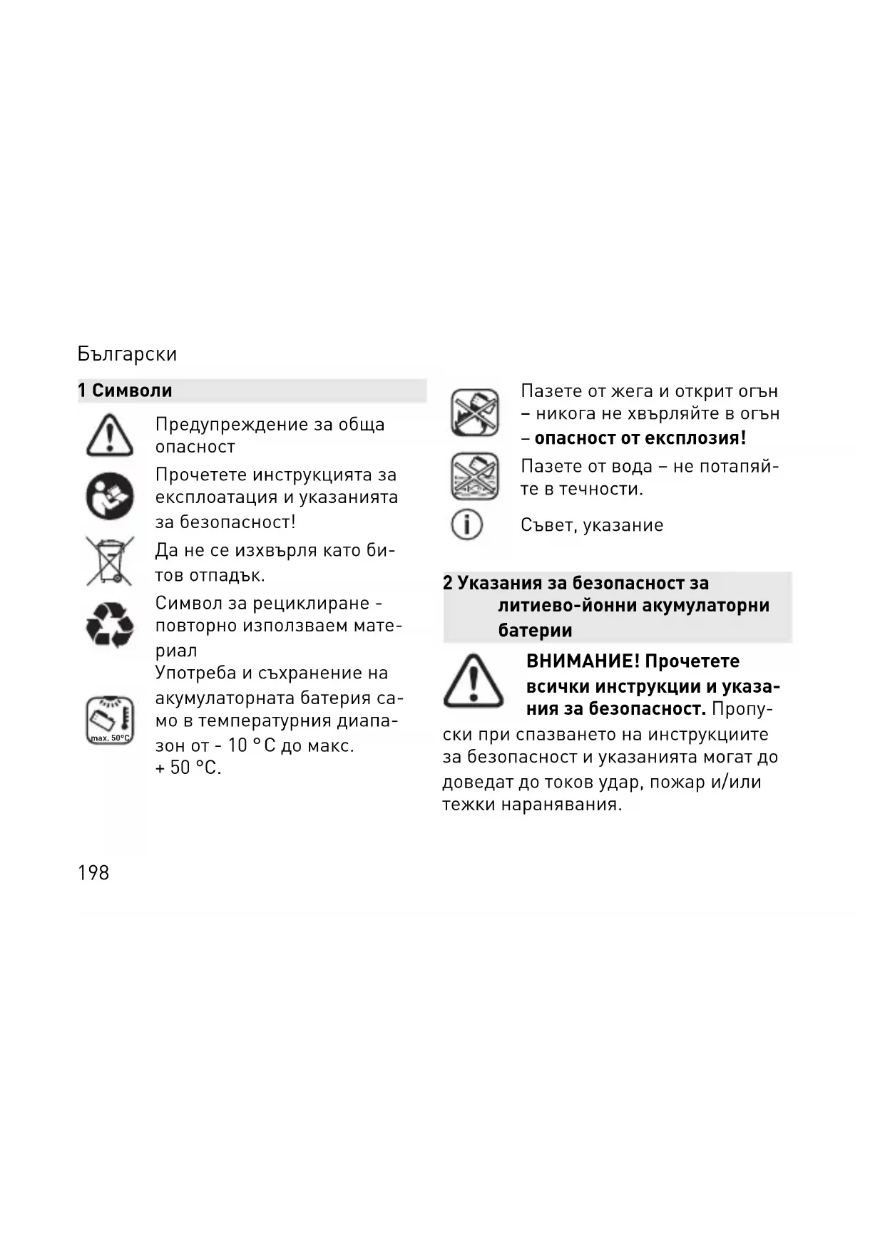 max. 50°C Употреба и съхранение на акумулаторната батерия са мо в температурния диапа зон от - 10 ° C до макс. + 50 °C. Пазете от жега и открит огън – никога не хвърляйте в огън