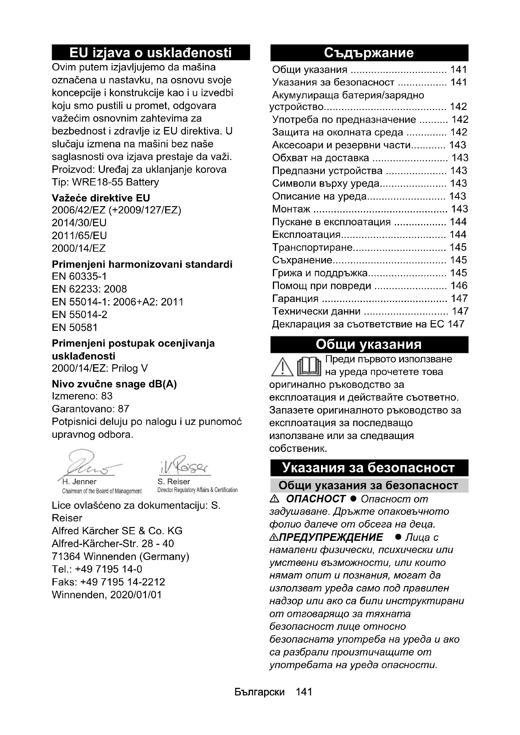 • намалени физически, психически или умствени възможности, или които нямат опит и познания, могат да използват уреда само под правилен надзор или ако са били инструктирани от отговарящо за тяхната безопасност лице относно безопасната употреба на уреда и ако са разбрали произтичащите от употребата на уреда опасности. Chairman of the Board of Management Director Regulatory Affairs & Certification H. Jenner S. Reiser Общи указания p. 141