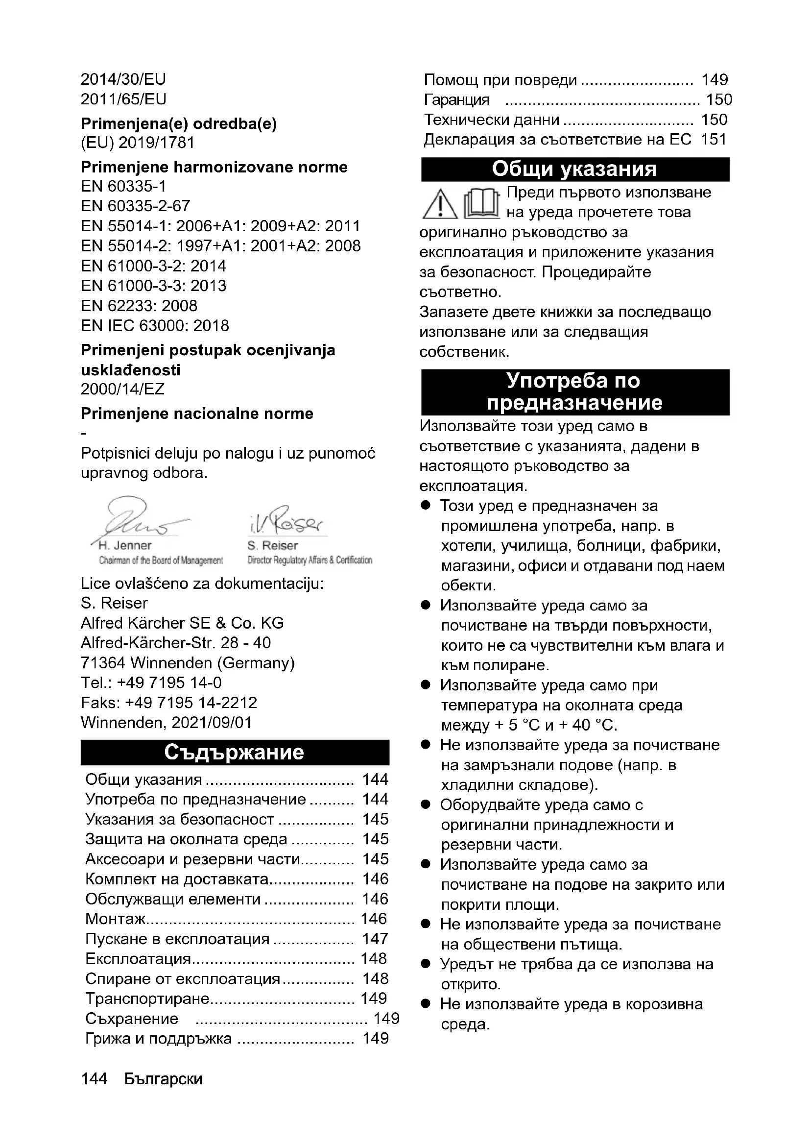 - Технически данни Декларация за съответствие на ЕС 151Български 145 Никога не използвайте уреда в потенциално застрашена от експлозии среда. Използвайте уреда само на повърхности с максимален наклон, посочен в раздел „Технически данни“. Към контакта в уреда включвайте само принадлежности, които са посочени в глава “Принадлежности”. Указания за безопасност Преди първото пускане на уреда в експлоатация прочетете и съблюдавайте настоящото ръководство за експлоатация и приложената брошура „Указания за безопасност на еднодискови машини за почистване“ № 5.956-659.0, и действайте съобразно p. 150