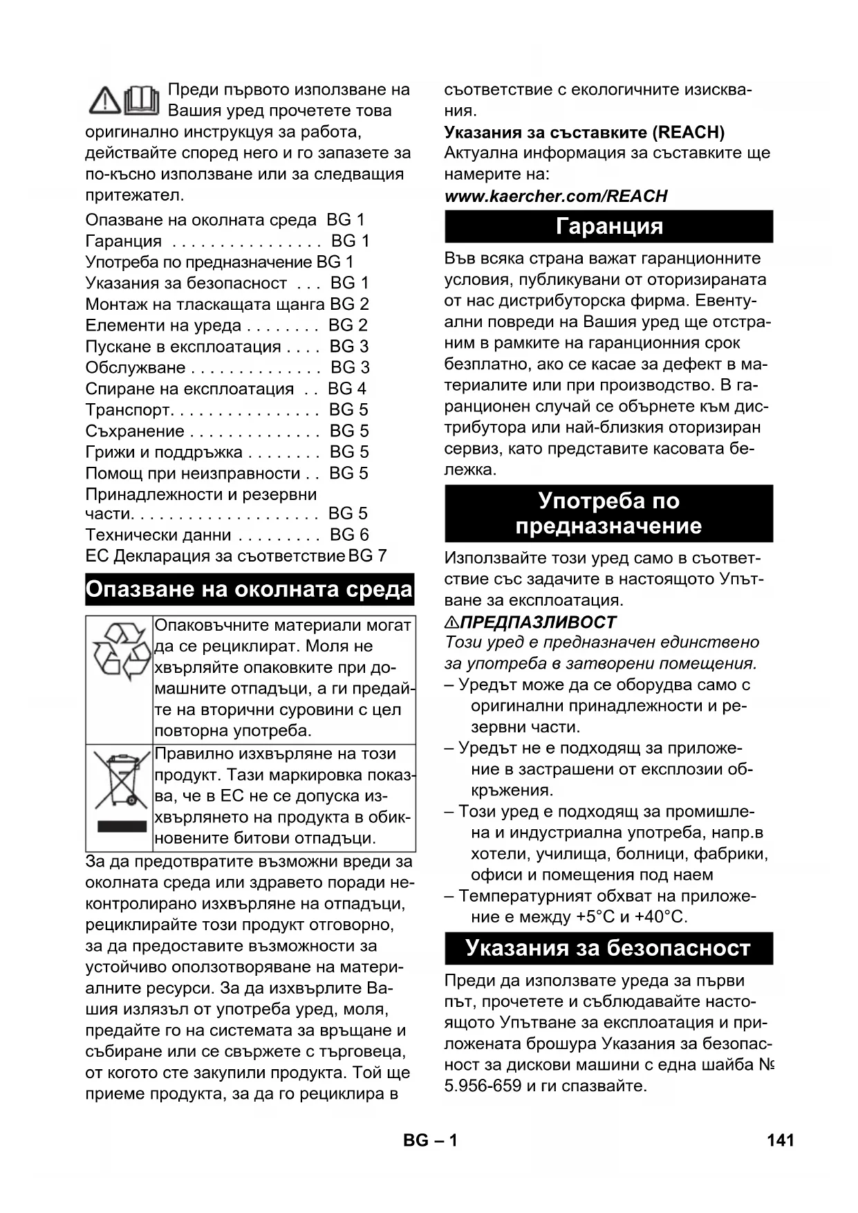 – Този уред е подходящ за промишле- на и индустриална употреба, напр.в хотели, училища, болници, фабрики, офиси и помещения под наем – Температурният обхват на приложе- ние е между +5°C и +40°C. Преди да използвате уреда за първи път, прочетете и съблюдавайте насто- ящото Упътване за експлоатация и при- ложената брошура Указания за безопас- ност за дискови машини с една шайба № 5.956-659 и ги спазвайте. Опазване на околната среда BG 1 Гаранция . . . . . . . . . . . . . . . . BG 1 Употреба по предназначение BG 1 Указания за безопасност . . . BG 1 Монтаж на тласкащата щанга BG 2 Елементи на уреда . . . . . . . . BG 2 Пускане в експлоатация . . . . BG 3 Обслужване . . . . . . . . . . . . . . BG 3 Спиране на експлоатация . . BG 4 Транспорт. . . . . . . . . . . . . . . . BG 5 Съхранение . . . . . . . . . . . . . . BG 5 Грижи и поддръжка . . . . . . . . BG 5 Помощ при неизправности . . BG 5 Принадлежности и резервни части. . . . . . . . . . . . . . . . . . . . BG 5 Технически данни . . . . . . . . . BG 6 EC Декларация за съответствиеBG 7 Опазване на околната среда Опаковъчните материали могат да се рециклират. Моля не хвърляйте опаковките при до- машните отпадъци, а ги предай- те на вторични суровини с цел повторна употреба. Правилно изхвърляне на този продукт. Тази маркировка показ- ва, че в ЕС не се допуска из- хвърлянето на продукта в обик- новените битови отпадъци.