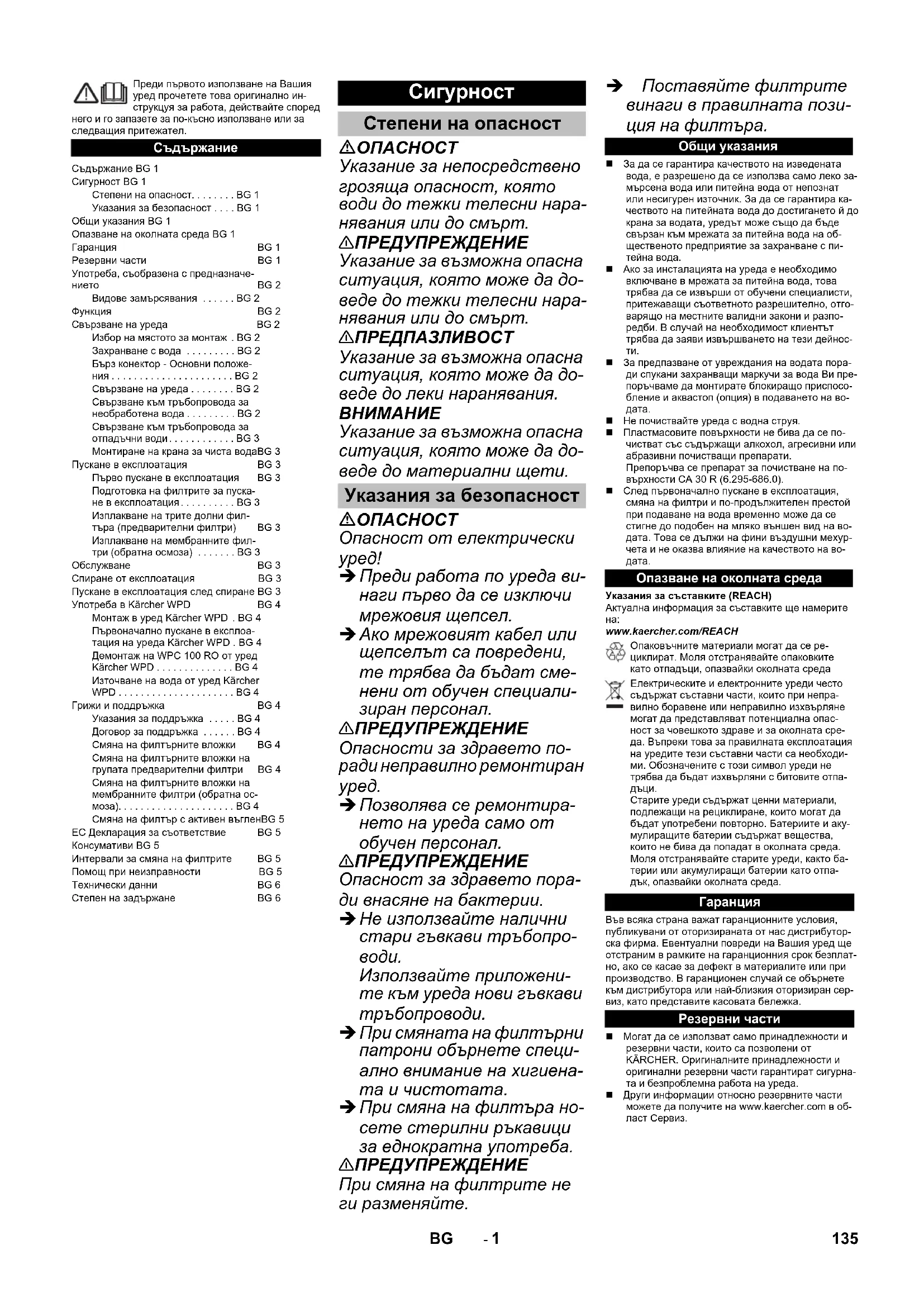Използвайте приложени- те към уреда нови гъвкави тръбопроводи. При смяната на филтърни патрони обърнете специ- ално внимание на хигиена- та и чистотата. При смяна на филтъра но- сете стерилни ръкавици за еднократна употреба. 몇 ПРЕДУПРЕЖДЕНИЕ При смяна на филтрите не ги разменяйте. Поставяйте филтрите винаги в правилната пози- ция на филтъра. За да се гарантира качеството на изведената вода, е разрешено да се използва само леко за-мърсена вода или питейна вода от непознат или несигурен източник. За да се гарантира ка-чеството на питейната вода до достигането й до крана за водата, уредът може също да бъде свързан към мрежата за питейна вода на об-щественото предприятие за захранване с пи-тейна вода. Ако за инсталацията на уреда е необходимо включване в мрежата за питейна вода, това трябва да се извърши от обучени специалисти, притежаващи съответното разрешително, отго-варящо на местните валидни закони и разпо-редби. В случай на необходимост клиентът трябва да заяви извършването на тези дейнос- За предпазване от увреждания на водата пора-ди спукани захранващи маркучи за вода Ви пре-поръчваме да монтирате блокиращо приспосо-бление и аквастоп (опция) в подаването на во-дата. Не почиствайте уреда с водна струя. Пластмасовите повърхности не бива да се по-чистват със съдържащи алкохол, агресивни или абразивни почистващи препарати.Препоръчва се препарат за почистване на по-върхности CA 30 R (6.295-686.0). След първоначално пускане в експлоатация, смяна на филтри и по-продължителен престой при подаване на вода временно може да се стигне до подобен на мляко външен вид на во-дата. Това се дължи на фини въздушни мехур-чета и не оказва влияние на качеството на во-дата.Указания за съставките (REACH)Актуална информация за съставките ще намерите www.kaercher.com/REACHВъв всяка страна важат гаранционните условия, публикувани от оторизираната от нас дистрибутор-ска фирма. Евентуални повреди на Вашия уред ще отстраним в рамките на гаранционния срок безплат-но, ако се касае за дефект в материалите или при производство. В гаранционен случай се обърнете към дистрибутора или най-близкия оторизиран сер-виз, като представите касовата бележка. Могат да се използват само принадлежности и резервни части, които са позволени от KÄRCHER. Оригиналните принадлежности и оригинални резервни части гарантират сигурна-та и безпроблемна работа на уреда. Други информации относно резервните части можете да получите на www.kaercher.com в об-ласт Сервиз.СъдържаниеСъдържание BG 1Сигурност BG 1Степени на опасност. . . . . . . . BG 1Указания за безопасност . . . . BG 1Общи указания BG 1Опазване на околната среда BG 1Гаранция BG 1Резервни части BG 1Употреба, съобразена с предназначе-нието BG 2Видове замърсявания . . . . . . BG 2Функция BG 2Свързване на уреда BG 2Избор на мястото за монтаж . BG 2Захранване с вода . . . . . . . . . BG 2Бърз конектор - Основни положе-ния . . . . . . . . . . . . . . . . . . . . . . BG 2Свързване на уреда . . . . . . . . BG 2Свързване към тръбопровода за необработена вода . . . . . . . . . BG 2Свързване към тръбопровода за отпадъчни води . . . . . . . . . . . . BG 3Монтиране на крана за чиста водаBG 3Пускане в експлоатация BG 3Първо пускане в експлоатация BG 3Подготовка на филтрите за пуска-не в експлоатация. . . . . . . . . . BG 3Изплакване на трите долни фил-търа (предварителни филтри) BG 3Изплакване на мембранните фил-три (обратна осмоза) . . . . . . . BG 3Обслужване BG 3Спиране от експло