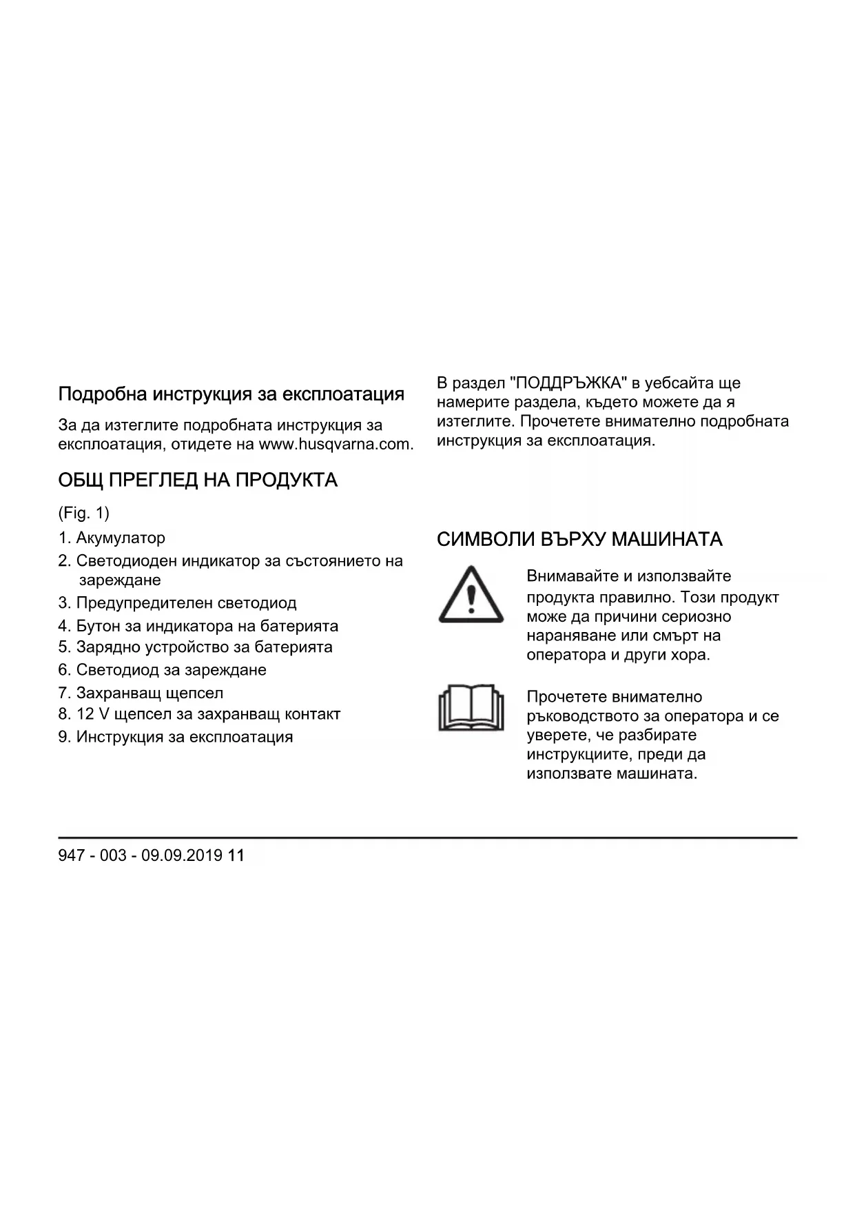 За да изтеглите подробната инструкция за експлоатация, отидете на www.husqvarna.com. В раздел "ПОДДРЪЖКА" в уебсайта ще намерите раздела, където можете да я изтеглите. Прочетете внимателно подробната инструкция за експлоатация. ОБЩ ПРЕГЛЕД НА ПРОДУКТА (Fig. 1)
