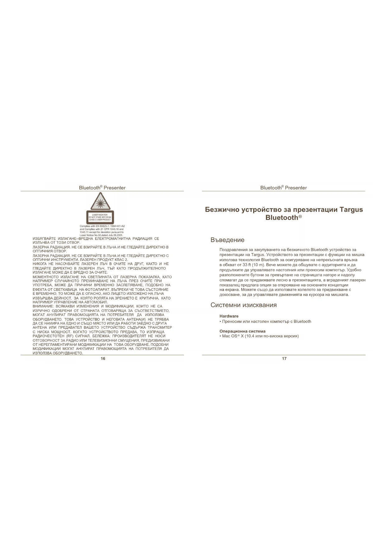 Поздравления за закупуването на безжичното Bluetooth устройство за презентации на Targus. Устройството за презентации с функции на мишка използва технология Bluetooth за осигуряване на непрекъсната връзка в обхват от 33 ft (10 m). Вече можете да общувате с аудиторията и да продължите да управлявате настолния или преносим компютър. Удобно разположените бутони за превъртане на страницата нагоре и надолу спомагат да се придвижвате лесно в презентацията, а вграденият лазерен показалец предлага опция за открояване на основните концепции на екрана. Можете също да използвате колелото за придвижване с докосване, за да управлявате движенията на курсора на мишката. Системни изисквания Hardware