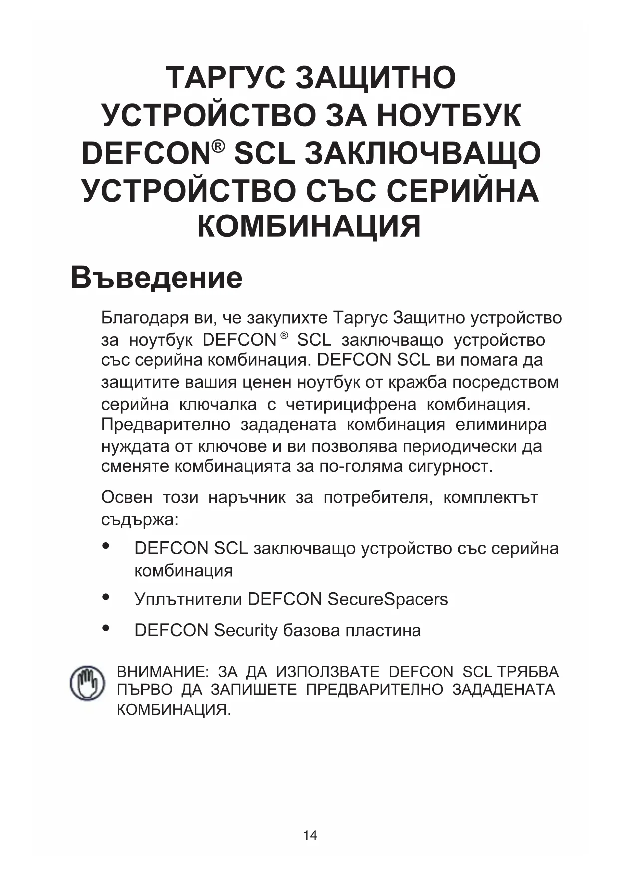 SCL заключващо устройство със серийна комбинация. DEFCON SCL ви помага да защитите вашия ценен ноутбук от кражба посредством серийна ключалка с четирицифрена комбинация. Предварително зададената комбинация елиминира нуждата от ключове и ви позволява периодически да сменяте комбинацията за по-голяма сигурност. Освен този наръчник за потребителя, комплектът