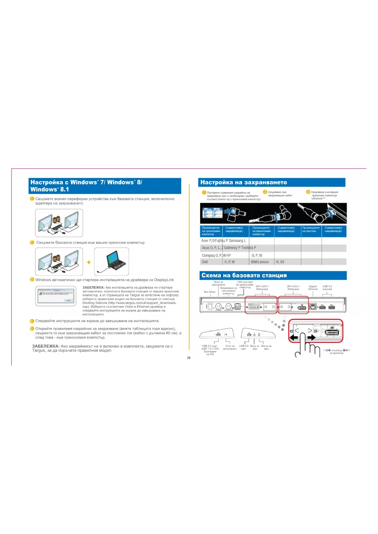плъзгаща се вратичкаСлот за заключванеUSB 3.0 портw/BC 1,2 (1,5A)Зареждане на iOSЗАБЕЛЕЖКА: Ако инсталацията на драйвера не стартира автоматично, изключете базовата станция от вашия преносим компютър, а от страницата на Targus за изтегляне на софтуер изберете правилния модел на базовата станция от списъка Docking Stations (http://www.targus.com/uk/support_downloads.asp). Изберете съответния Video и Ethernet драйвер и следвайте инструкциите на екрана до завършване на инсталацията Съвместим(и) накрайник(ци)Производител на преносимия компютърПроизводител на преносимия компютърСъвместим(и) накрайник(ци)Производител на лаптопаСъвместим(и) накрайник(ци) BG – Български (език)26 Меню за управление на DisplayLink ОПЦИИ НА МЕНЮТО ФУНКЦИЯ Управление на DisplayLink Отваря прозореца за резолюция на екранаПроверка за актуализации Проверява онлайн за налични за изтегляне нови драйвери Устройства на DisplayLink Показва списък от свързаните към DisplayLink устройстваНастройка на звука Отваря прозорец за конфигуриране на звукаНастройка на видео Отваря прозорец за резолюция на екранаРезолюция на екранаПоказва списък на предлаганите резолюции на екрана. (Логическите режими не се предлагат в режим на огледално изображение)Завъртане на екранаЗавърта екрана по посока на часовниковата стрелка или в обратна посокаРазширяване Разширява работния плот на Windows на този дисплейЗадаване като основен мониторЗадава настоящият екран като основен дисплейИзключване на монитора на ноутбукаИзключва дисплея на преносимия компютър и използва дисплея на DisplayLink като основен (работи само при компютри и само при свързване на един екран DisplayLink)Огледален образПоказва същото съдържание и на двата екрана (резолюциите на екраните трябва да съвпадат)Изкл. Изключва дисплея на DisplayLinkОптимизиране за видеоИзберете за подобрено видеовъзпроизвеждане на свързани към DisplayLink дисплеи (приложима само за видео; възможно е текстът да бъде неясен)Вместване на ТВ екранРегулира размера на работния плот на Windows така, че да вмести съдържанието на свързан телевизионен екран (работи само при свързване на една базова станция DisplayLink, установена в режим Extend (Разширен))
