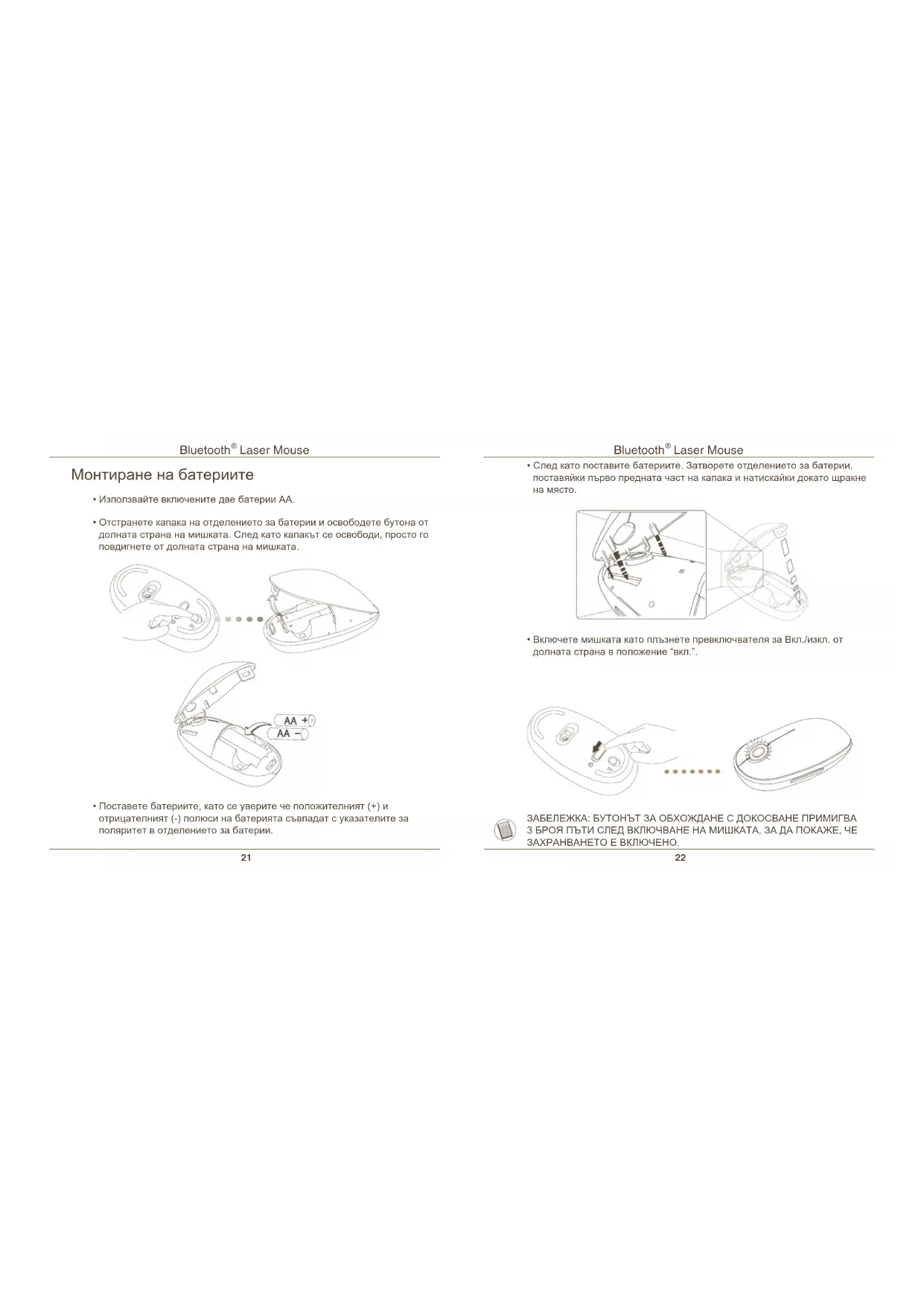 настройката. Мишката трябва “да открие” режим на свързване. За да активирате режими на “откриване”, включете мишката и след 3 секунди натиснете произволен бутон, за да влезете в режим на откриване.