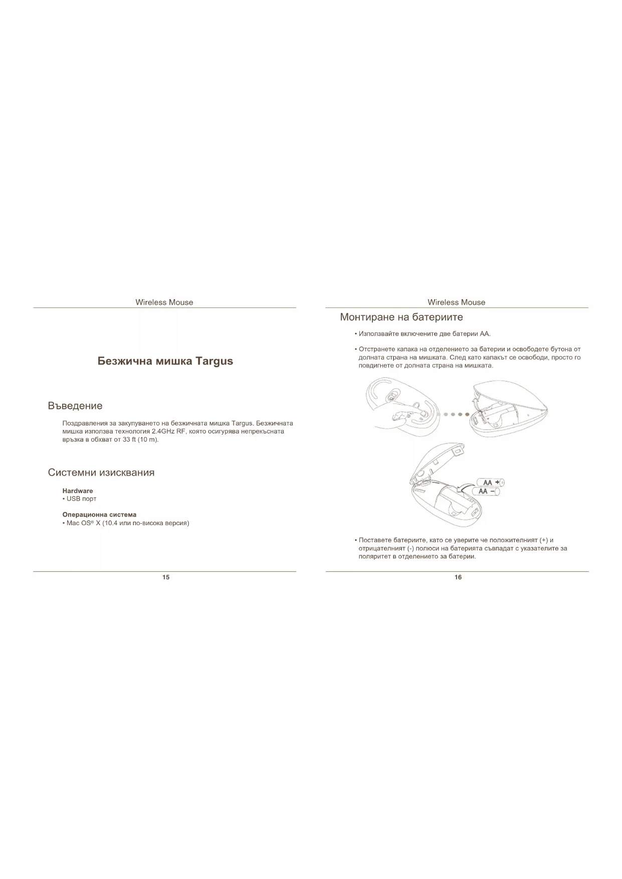 Поздравления за закупуването на безжичната мишка Targus. Безжичната мишка използва технология 2.4GHz RF, която осигурява непрекъсната връзка в обхват от 33 ft (10 m). Системни изисквания Hardware