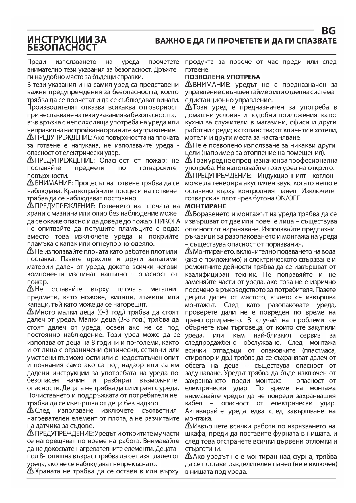 La placa no permite activar una función especial. El regulador de potencia limita los niveles de potencia de acuerdo con el valor máximo ajustado para la placa. Consulte el apartado “Gestión de potencia“. P. ej.: [Nivel de potencia inferior al nivel solicitado] La placa ajusta automáticamente un nivel de potencia mínimo para garantizar que se pueda utilizar la zona de cocción. El regulador de potencia limita los niveles de potencia de acuerdo con el valor máximo ajustado para la placa. Consulte el apartado “Gestión de potencia“. Manual del usuario ESПреди използването на уреда прочетете внимателно тези указания за безопасност. Дръжте ги на удобно място за бъдещи справки. В тези указания и на самия уред са представени важни предупреждения за безопасността, които трябва да се прочетат и да се съблюдават винаги. Производителят отказва всякаква отговорност при неспазване на тези указания за безопасността, във връзка с неподходяща употреба на уреда или неправилна настройка на органите за управление. ПРЕДУПРЕЖДЕНИЕ: Ако повърхността на плочата за готвене е напукана, не използвайте уреда - опасност от електрически удар. ПРЕДУПРЕЖДЕНИЕ: Опасност от пожар: не поставяйте предмети по готварските повърхности. ВНИМАНИЕ: Процесът на готвене трябва да се наблюдава. Краткотрайните процеси на готвене трябва да се наблюдават постоянно. ПРЕДУПРЕЖДЕНИЕ: Готвенето на плочата на храни с мазнина или олио без наблюдение може да се окаже опасно и да доведе до пожар. НИКОГА не опитвайте да потушите пламъците с вода: вместо това изключете уреда и покрийте пламъка с капак или огнеупорно одеяло. Не използвайте плочата като работен плот или поставка. Пазете дрехите и други запалими материи далеч от уреда, докато всички негови компоненти изстинат напълно - опасност от