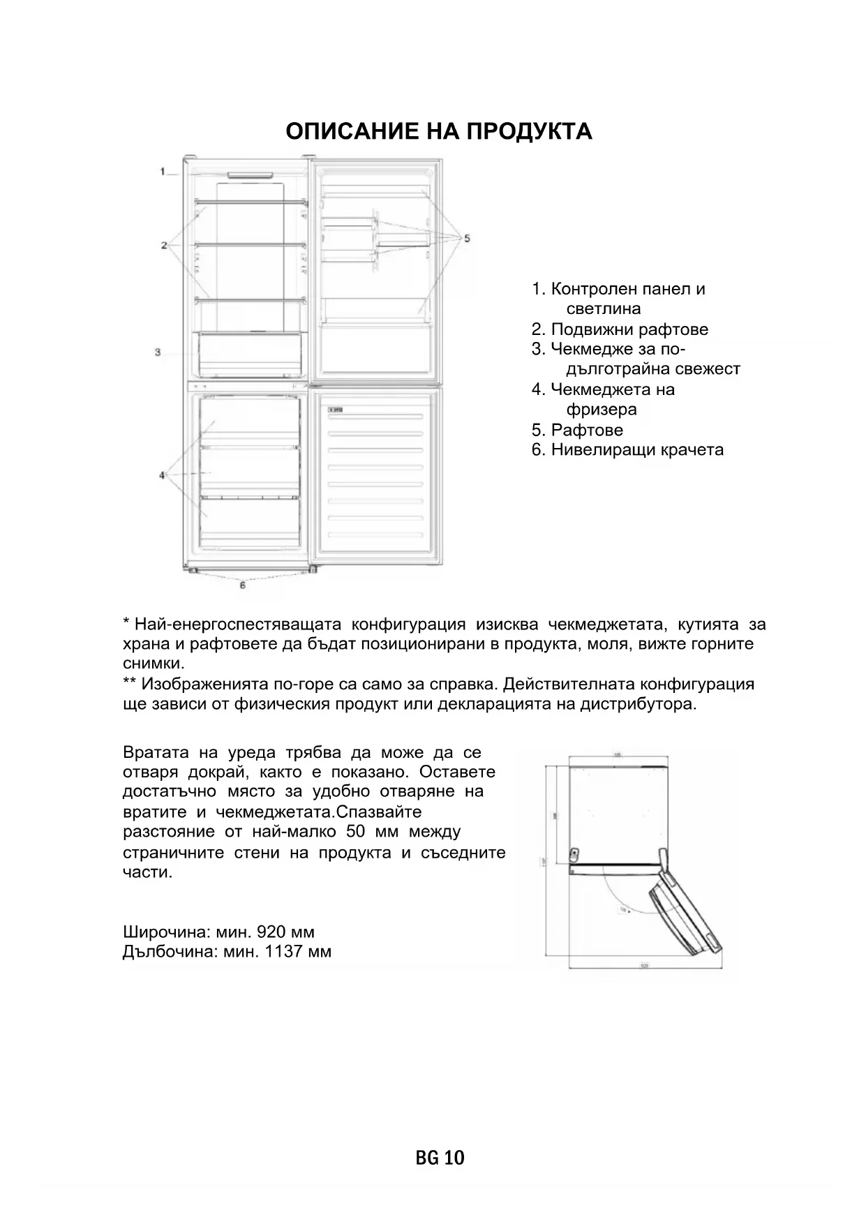 ** Изображенията по-горе са само за справка. Действителната конфигурация ще зависи от физическия продукт или декларацията на дистрибутора. Вратата на уреда трябва да може да се отваря докрай, както е показано. Оставете
