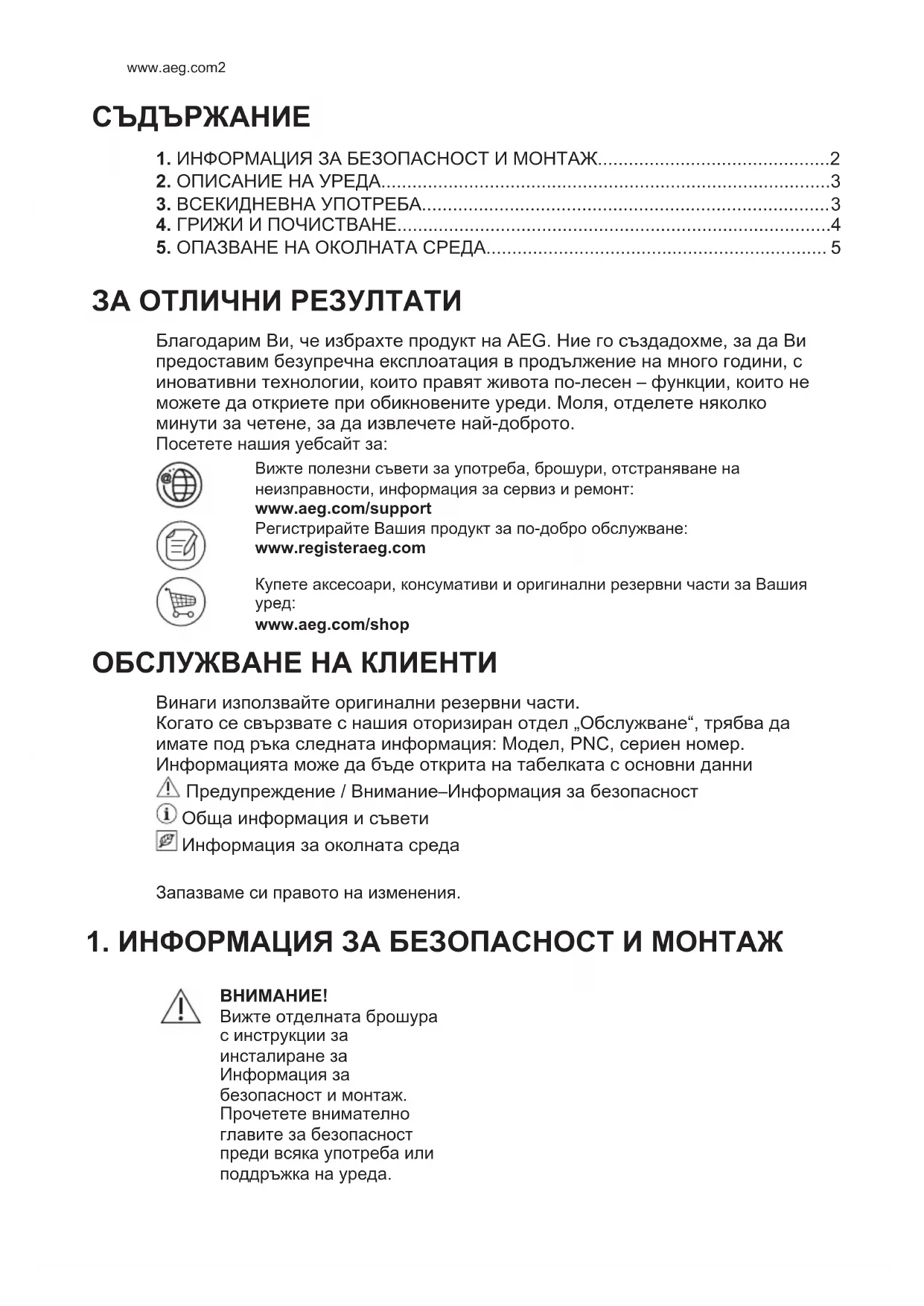 www.aeg.com/shop ОБСЛУЖВАНЕ НА КЛИЕНТИ Винаги използвайте оригинални резервни части. Когато се свързвате с нашия оторизиран отдел „Обслужване“, трябва да имате под ръка следната информация: Модел, PNC, сериен номер. Информацията може да бъде открита на табелката с основни данни Предупреждение / Внимание–Информация за безопасност Обща информация и съвети Информация за околната среда Запазваме си правото на изменения.