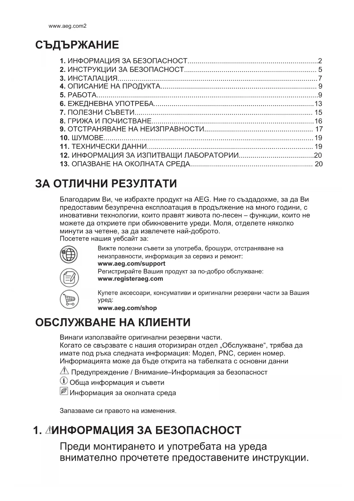 ЗА ОТЛИЧНИ РЕЗУЛТАТИ Благодарим Ви, че избрахте продукт на AEG. Ние го създадохме, за да Ви предоставим безупречна експлоатация в продължение на много години, с иновативни технологии, които правят живота по-лесен – функции, които не можете да откриете при обикновените уреди. Моля, отделете няколко минути за четене, за да извлечете най-доброто. Посетете нашия уебсайт за: Вижте полезни съвети за употреба, брошури, отстраняване на неизправности, информация за сервиз и ремонт: www.aeg.com/support Регистрирайте Вашия продукт за по-добро обслужване: www.registeraeg.com Купете аксесоари, консумативи и оригинални резервни части за Вашия