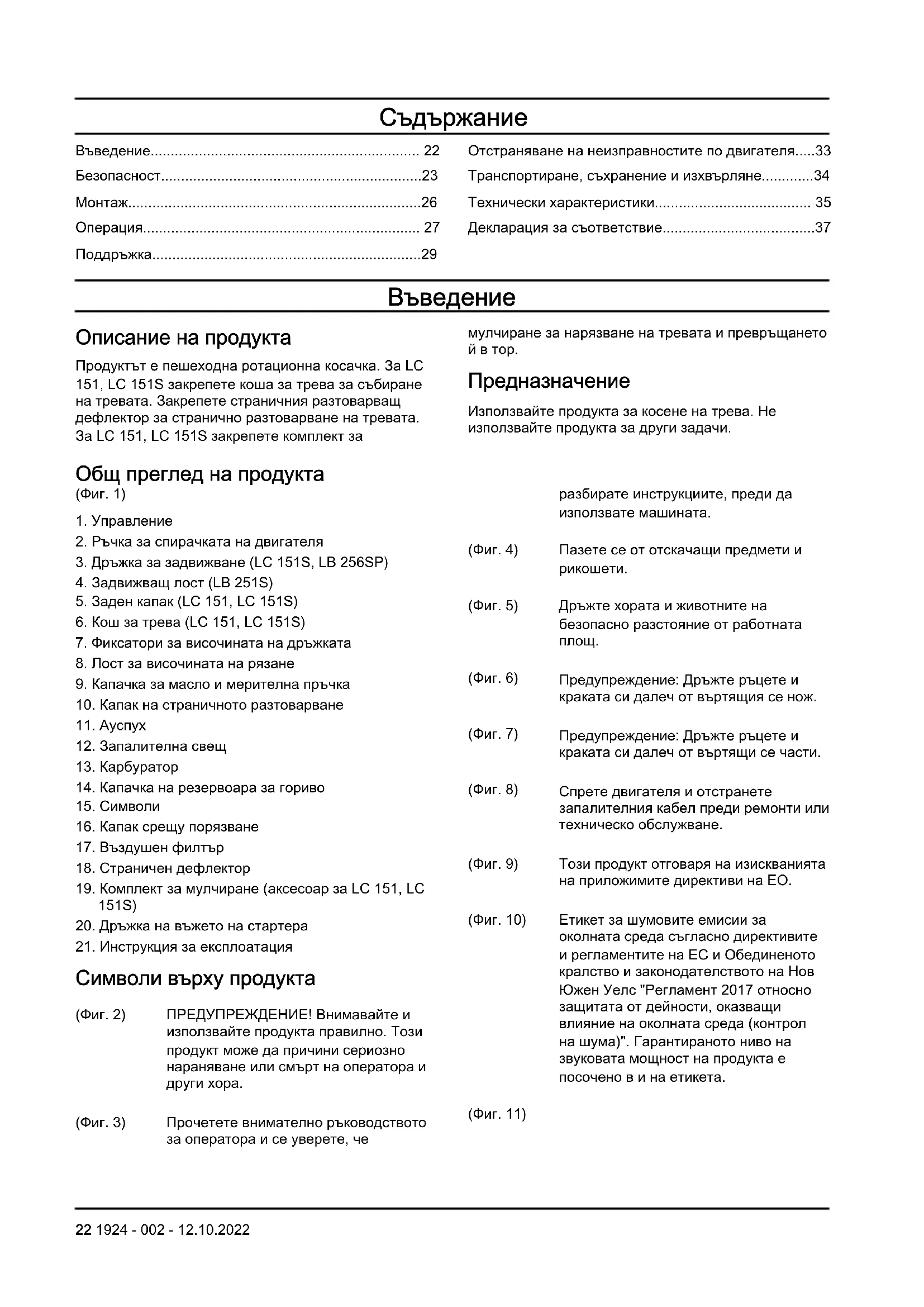 Описание на продукта Продуктът е пешеходна ротационна косачка. За LC 151, LC 151S закрепете коша за трева за събиране на тревата. Закрепете страничния разтоварващ дефлектор за странично разтоварване на тревата. За LC 151, LC 151S закрепете комплект за мулчиране за нарязване на тревата и превръщането