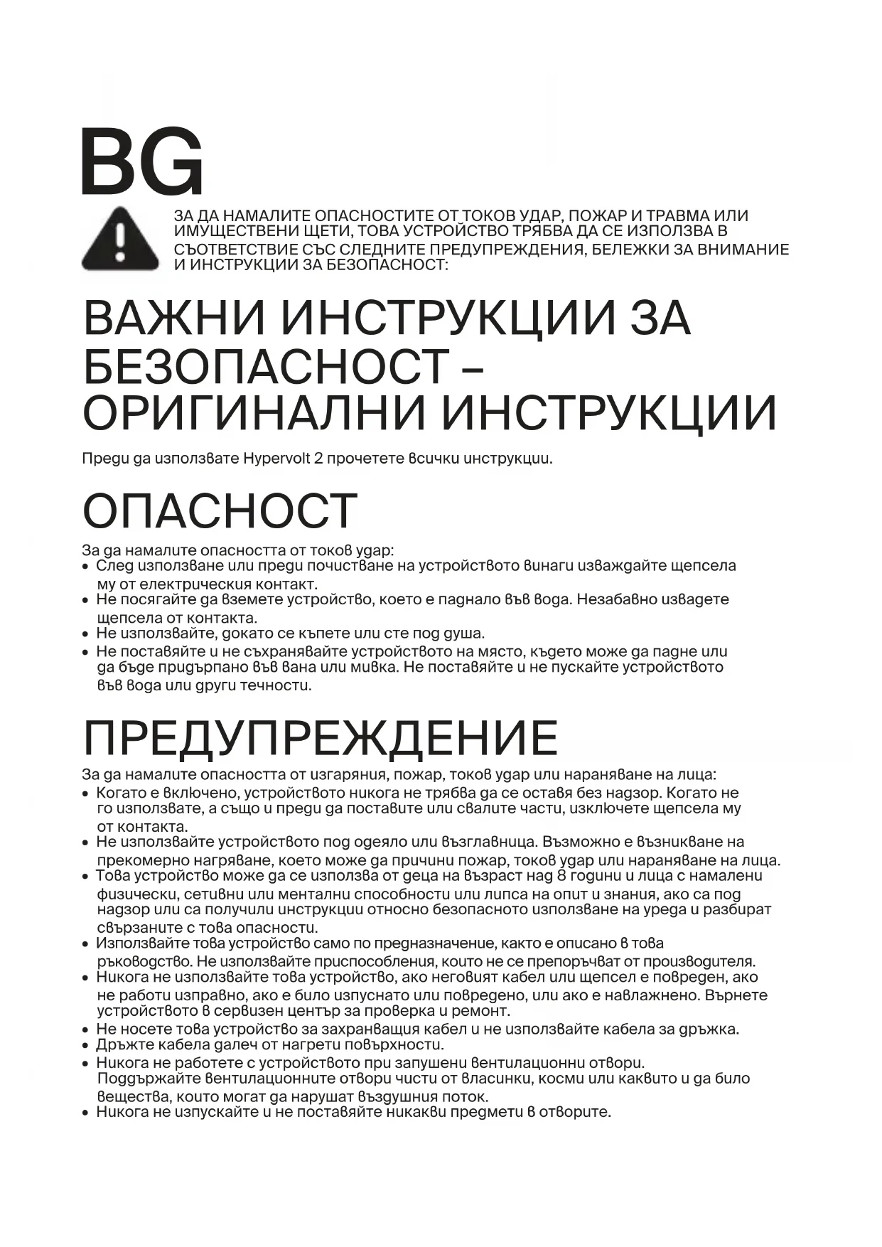 - Бременност, диабет с усложнения, като невропатия или увреждане на ретината, използване на пейсмейкъри, скорошна операция или нараняване, епилепсия или мигрена, дискови хернии, спондилолистеза, спондилолиза или спондилоза, скорошни смени на стави, вътрематочна спирала, метални щифтове или плочи или всякакви притеснения относно Вашето физическо здраве. Слаби физически лица и деца трябва да бъдат придружавани от възрастен, когато използват перкусионни или вибрационни устройства. Тези противопоказания не означават, че не можете да използвате перкусионно или вибрационно устройство, но Ви съветваме преди това да се консултирате с лекаря си. Провеждат се текущи проучвания относно въздействието на перкусионен масаж за специфични медицински разстройства, които могат да доведат до съкращаване на горепосочения списък с противопоказания. Hypervolt 2 съдържа батерия, която трябва да бъде безопасно обработена в подходящ пункт за обезвреждане или рециклиране на електронно оборудване.
