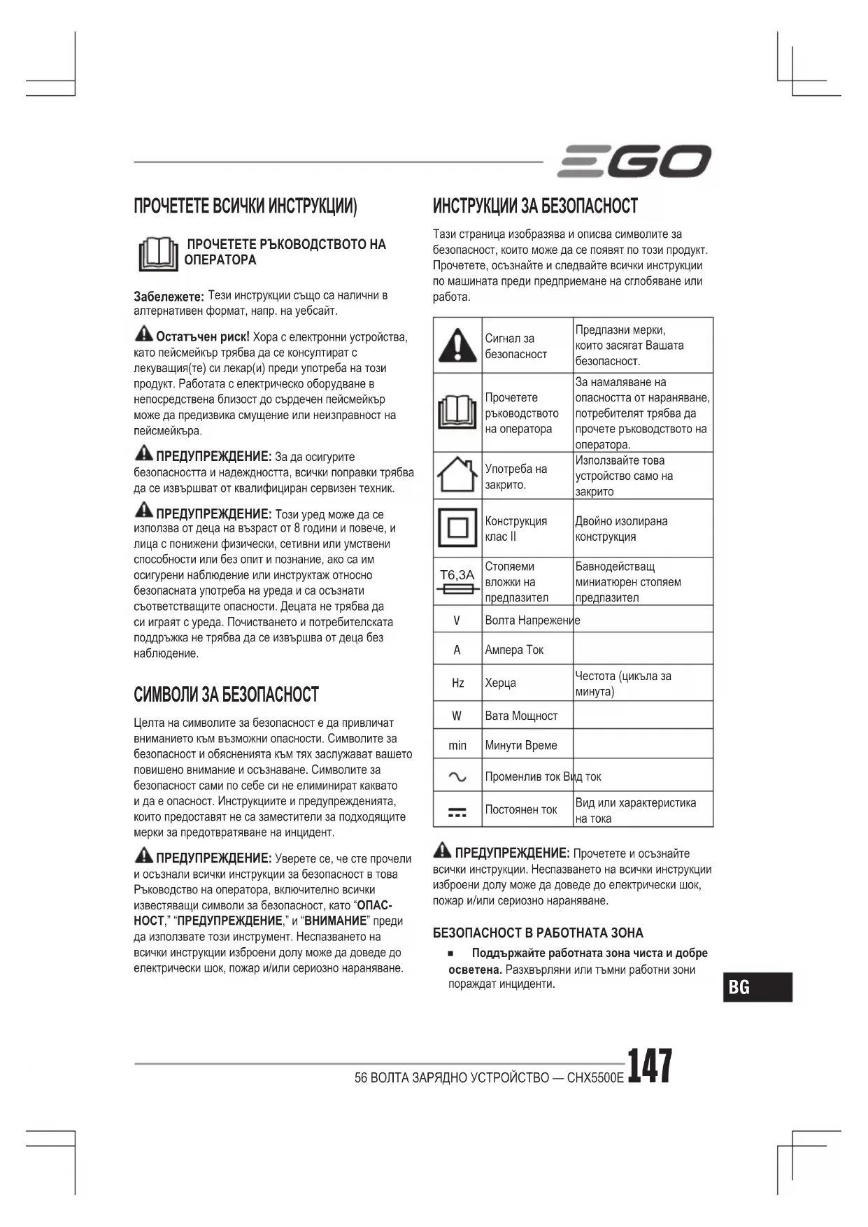 Изтеглете инструкциите за вашия Зарядно за батерии в PDF формат безплатно! Намерете ръководството си CHX5500 - EGO и вземете отново електронното си устройство в ръце. На тази страница са публикувани всички документи, необходими за използването на вашето устройство. CHX5500 на марката EGO.