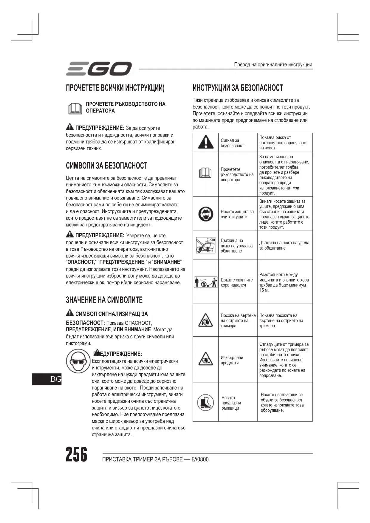 ПРОЧЕТЕТЕ ВСИЧКИ ИНСТРУКЦИИ) ПРОЧЕТЕТЕ РЪКОВОДСТВОТО НА ОПЕРАТОРА ПРЕДУПРЕЖДЕНИЕ: За да осигурите безопасността и надеждността, всички поправки и подмени трябва да се извършват от квалифициран сервизен техник. СИМВОЛИ ЗА БЕЗОПАСНОСТ Целта на символите за безопасност е да превличат вниманието към възможни опасности. Символите за безопасност и обясненията към тях заслужават вашето повишено внимание и осъзнаване. Символите за безопасност сами по себе си не елиминират каквато и да е опасност. Инструкциите и предупрежденията, които предоставят не са заместители за подходящите мерки за предотвратяване на инцидент. ПРЕДУПРЕЖДЕНИЕ: Уверете се, че сте прочели и осъзнали всички инструкции за безопасност в това Ръководство на оператора, включително всички известяващи символи за безопасност, като “ОПАСНОСТ,” “ПРЕДУПРЕЖДЕНИЕ,” и “ВНИМАНИЕ” преди да използвате този инструмент. Неспазването на всички инструкции изброени долу може да доведе до електрически шок, пожар и/или сериозно нараняване. ЗНАЧЕНИЕ НА СИМВОЛИТЕ СИМВОЛ СИГНАЛИЗИРАЩ ЗА БЕЗОПАСНОСТ: Показва ОПАСНОСТ, ПРЕДУПРЕЖДЕНИЕ, ИЛИ ВНИМАНИЕ. Могат да бъдат използвани във връзка с други символи или пиктограми. ПРЕДУПРЕЖДЕНИЕ: Експлоатацията на всички електрически инструменти, може да доведе до изхвърляне на чужди предмети към вашите очи, което може да доведе до сериозно нараняване на окото. Преди започване на работа с електрически инструмент, винаги носете предпазни очила със странична защита и визьор за цялото лице, когато е необходимо. Ние препоръчваме предпазна маска с широк визьор за употреба над очила или стандартни предпазни очила със странична защита. ИНСТРУКЦИИ ЗА БЕЗОПАСНОСТ Тази страница изобразява и описва символите за безопасност, които може да се появят по този продукт. Прочетете, осъзнайте и следвайте всички инструкции по машината преди предприемане на сглобяване или работа.Сигнал за безопасностПоказва риска от потенциално нараняване на човек.Прочетете ръководството на оператораЗа намаляване на опасността от нараняване, потребителят трябва да прочете и разбере ръководството на оператора преди използването на този продукт.Носете защита за очите и ушитеВинаги носете защита за ушите, предпазни очила със странична защита и предпазен екран за цялото лице, когато работите с този продукт. 20cm Дължина на ножа на уреда за обкантванеДължина на ножа на уреда за обкантване 15m Дръжте околните хора надалечРазстоянието между машината и околните хора трябва да бъде минимум 15 м.Посока на въртене на острието на тримераПоказва посоката на въртене на острието на тримера.Изхвърлени предметиОтпадъците от тримера за ръбове могат да повлияят на стабилната стойка. Използвайте повишено внимание, когато се разхождате по зоната на подрязване.Носете предпазни ръкавициНосете неплъзгащи се обувки за безопасност, когато използвате това оборудване.Превод на оригиналните инструкцииПРИСТАВКА ТРИМЕР ЗА РЪБОВЕ — EA0800 257