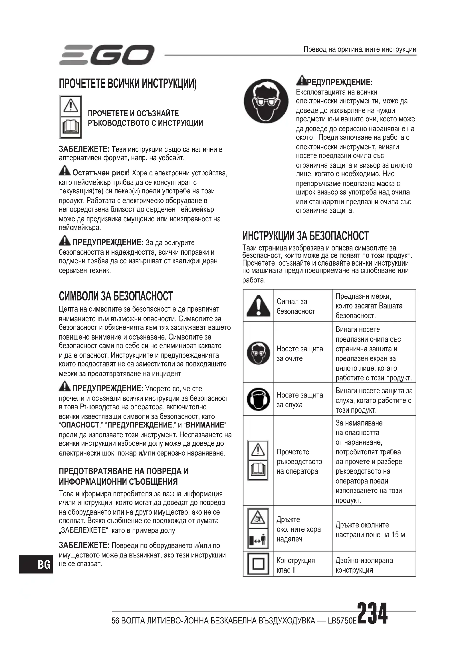 Дръжте околните настрани поне на 15 м. Конструкция клас II Двойно-изолирана конструкция Превод на оригиналните инструкции56 ВОЛТА ЛИТИЕВО-ЙОННА БЕЗКАБЕЛНА ВЪЗДУХОДУВКА — LB5750E