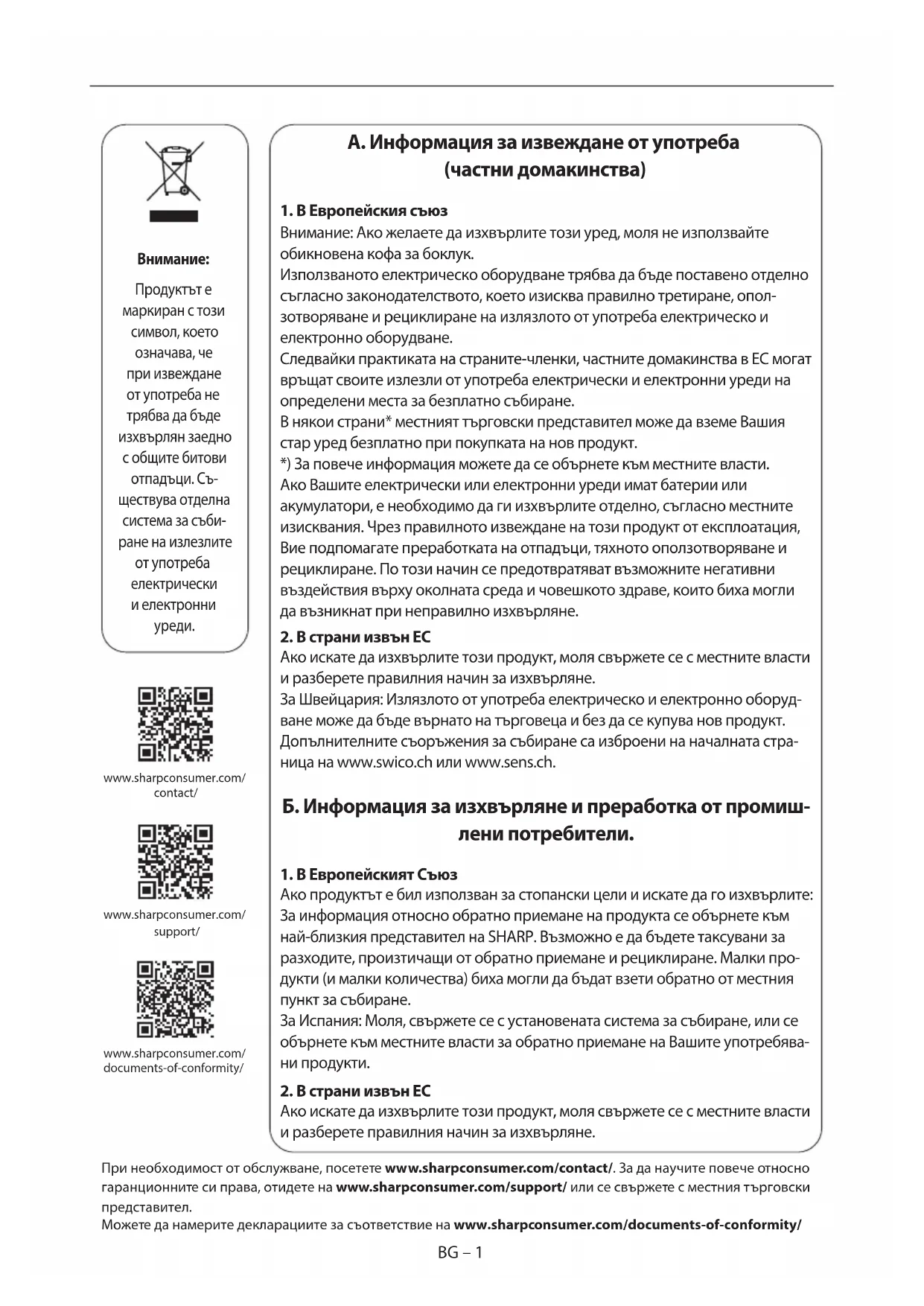 Ако искате да изхвърлите този продукт, моля свържете се с местните власти и разберете правилния начин за изхвърляне. При необходимост от обслужване, посетете www.sharpconsumer.com/contact/. За да научите повече относно гаранционните си права, отидете на www.sharpconsumer.com/support/ или се свържете с местния търговски представител. Можете да намерите декларациите за съответствие на www.sharpconsumer.com/documents-of-conformity/ www.sharpconsumer.com/support/www.sharpconsumer.com/documents-of-conformity/www.sharpconsumer.com/contact/ BG – 2BG – 2 МЕРКИ ЗА БЕЗОПАСНОСТ ПРОТИВ ИЗЛАГАНЕ НА МИКРОВЪЛНОВО