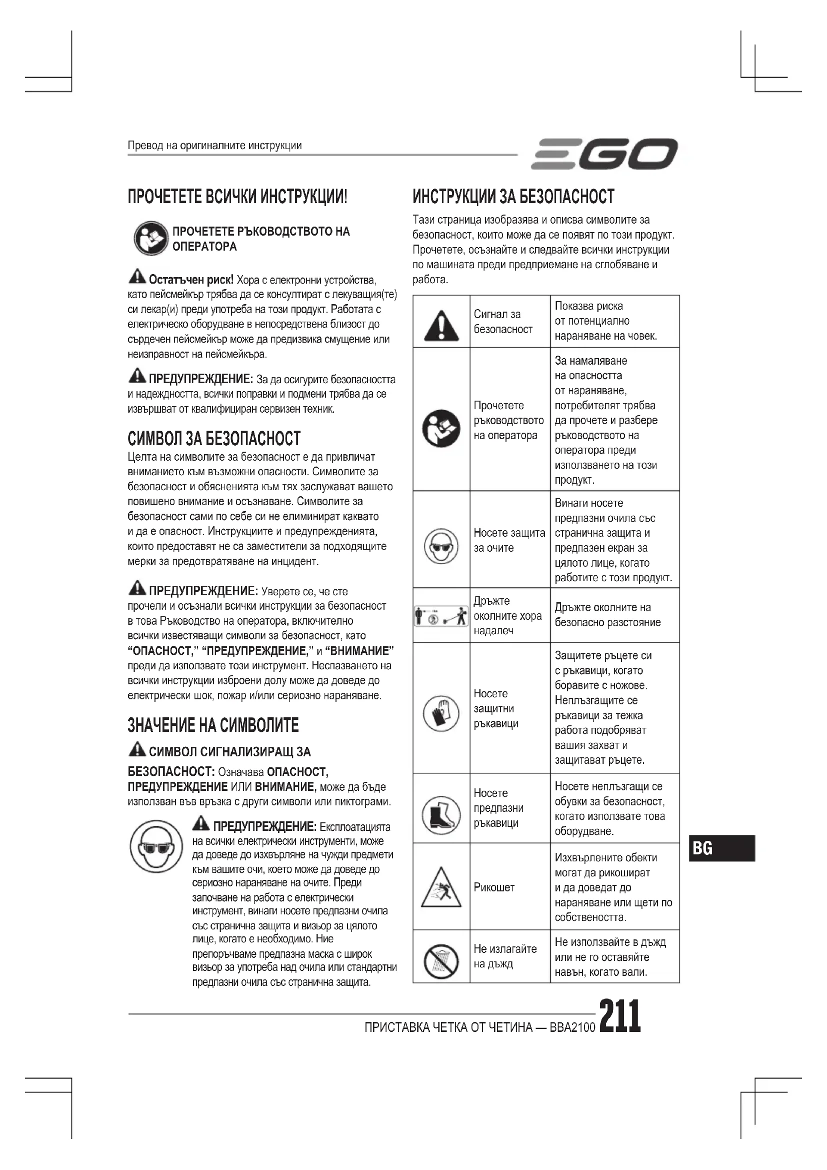 РЪКОВОДСТВО ЗА ПОТРЕБИТЕЛЯ BBA2100 EGO