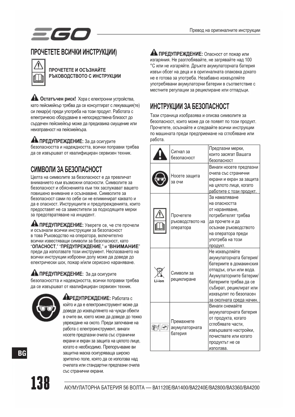ХерцаЧестота (цикъла за минута) Вата Мощност min Минути ВремеПроменлив ток Вид токПостоянен токВид или характеристика на тока ПРЕДУПРЕЖДЕНИЕ: Прочетете и осъзнайте всички инструкции. Неспазването на всички инструкции изброени може да доведе до електрически шок, пожар и/или сериозно нараняване. Терминът „електроинструмент“ при всички изброени предупреждения се отнася за ливадни и градински машини управляване със захранване EGO + акумулаторна батерия. БЕЗОПАСНОСТ В РАБОТНАТА ЗОНА ◾ Поддържайте работната зона чиста и добре осветена. Разхвърляни или тъмни работни зони пораждат инциденти. ◾ Не работете с електроинструменти в експлозивна среда, като например в присъствието на запалими течности, газ или прах. Електроинструментите може да създадат искри, които може да възпламенят праха или изпаренията. ЕЛЕКТРИЧЕСКА БЕЗОПАСНОСТ ◾ Не излагайте електроинструментите на дъжд или влажни условия. Навлизането на вода в електроинструмент ще увеличи риска от електрически шок. ◾ Използвайте само с зарядните устройства изброени долу:АКУМУЛАТОРНИ БАТЕРИИ ЗАРЯДНО УСТРОЙСТВОBA1120E, BA1400, BA2240E, BA2800, BA3360, BA4200CH5500E, CH2100E УПОТРЕБА И ГРИЖА ЗА ИНСТРУМЕНТ НА